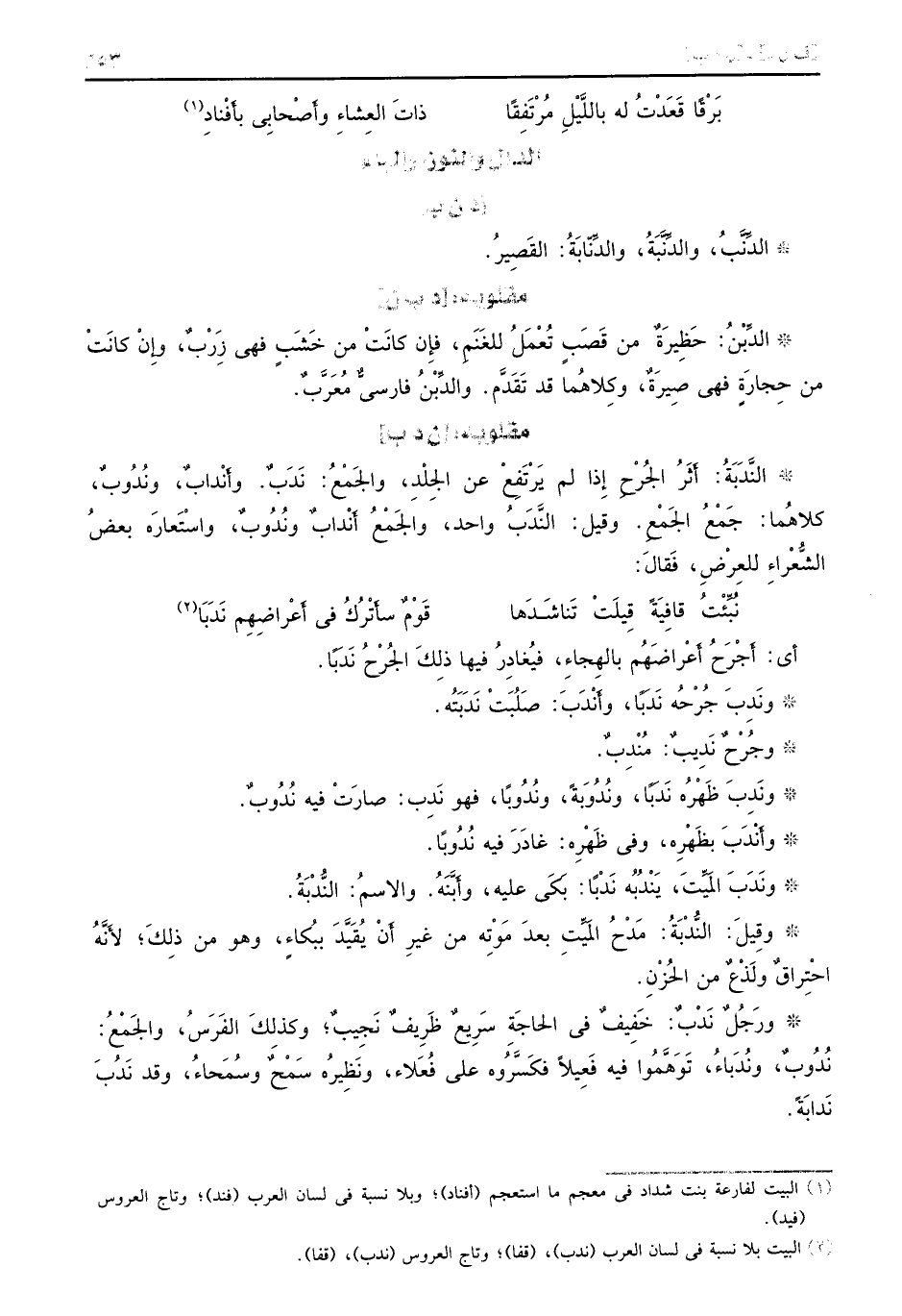 : [ن د ب] النَّدَبَةُ: أَثَرُ الجُرحِ إِذا لم يَرْتَفِعْ عن الجِلْدِ، والجَمْعُ: نَدَبٌ. وأَنْدابٌ، ونَدُوبٌ، كلاهُما: جَمْعُ الجَمْعِ. وقيل: النَّدَبُ واحد، والجِمْعُ أَنْدابٌ ونُدُوبٌ، واسْتَعارَه بعضُ الشُّعْراءِ للِعرْضِ، فَقالَ: