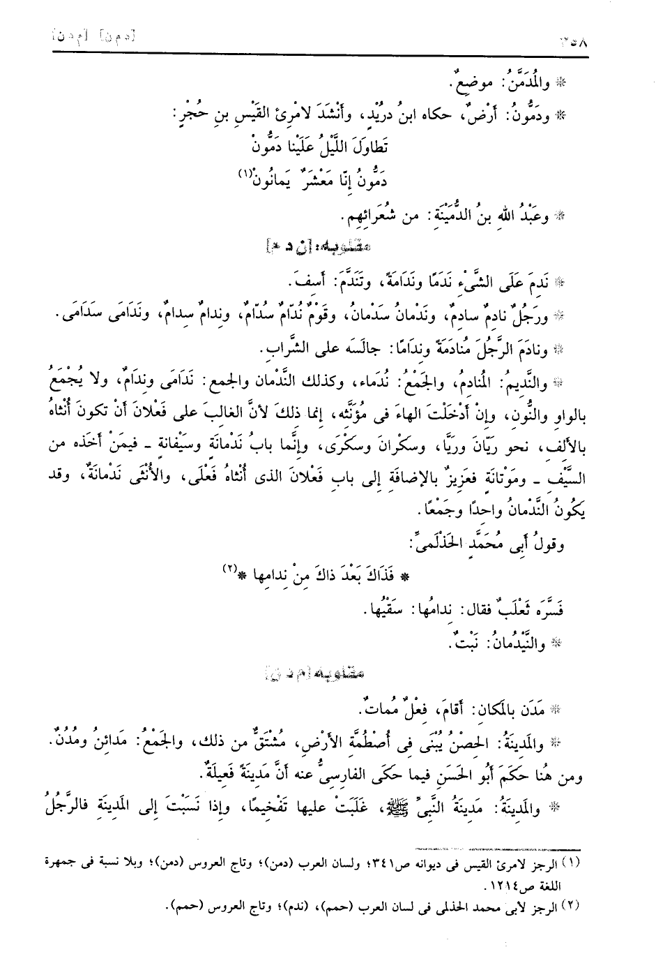 [م د ن] مَدَن بالمَكانِ: أَقامَ، فِعْلٌ مُماتٌ. والمَدِينَةُ: الحِصْنُ يُبْنَى فِي أُصْطُمَّةِ الأَرْضِ، مُشْتَِقٌّ من ذلك، والجَمْعُ: مَدائِنُ ومُدُنٌ. ومن هُنا حَكَمَ أَبُو الحَسَنِ فيما حَكَى الفارِسِيُّ عنه أَنَّ مَدِينَةً فَعِيلَةٌ. والمَديِنَةُ: مَدِينَةُ النَّبِي صلى الله عليه وسلم، غَلَبَتْ عليها تَفْخِيماًُ، وإذا نَسَبْتَ إِلى المَدِينَةِ فالرَّجُلُ