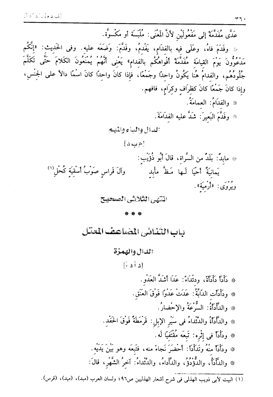 [د أد أ] دَأْدَأَ دَأْدَأَةً، ودِئَدَاءً: عَدَا أَشَدَّ العَدْوِ. ودَأْدَأَتِ الدّابَّةُ: عَدَتْ عَدْواً فَوْقَ العَنَقِ. والدَّأْدَأَةُ: السُّرْعَةُ والإحْضارُ. والدَّأْدَأَةُ والدِّئْداءً في سَيْرِ الإِبِلِ: قَرْمَطَةٌ فَوْقَ الحَفْدٍ. ودَأْدَأَ في إِثْرِه: تَبِعَه مُقْتَفِياً لَه. ودَأْدَأً مْنْهُ وتَدَأْدَأ: أَحْضَرَ نَجاءً منه، فتَبَعَه وهو بَيْنَ يَدَيْهِ. والدَّأْدَأُ، والدُّؤْدُؤُ، والدَّأْداءُ، والدِّئْداءُ: آخِرُ الشَّهْرِ، قالَ: