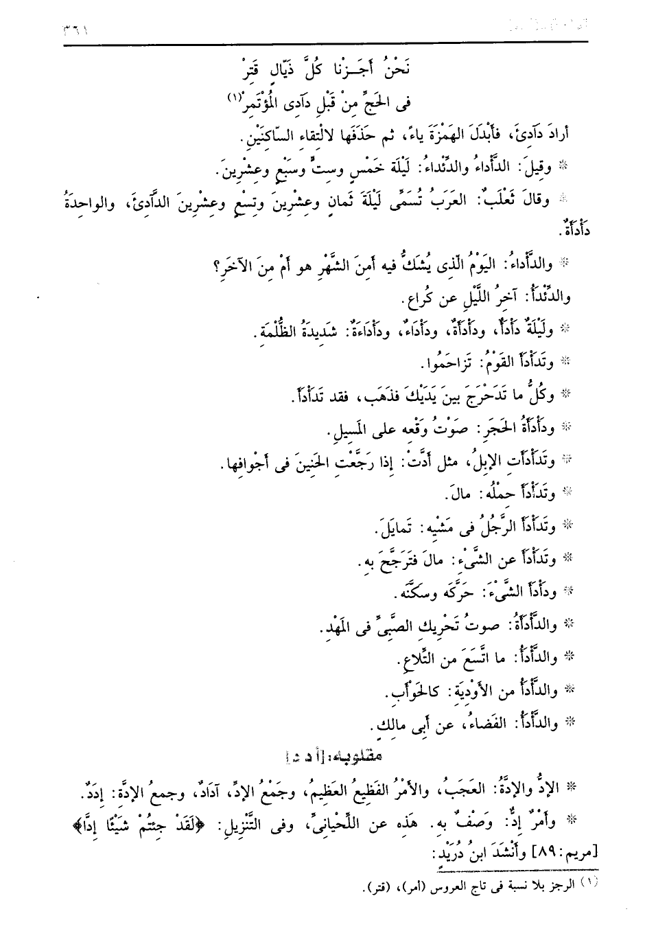 أرادَ دَآدِئَ، فأَبْدَلَ الهَمْزَةَ ياءً، ثم حَذَفَها لالْتِقاءِ السّاكَنَيْنِ. وقِيلَ: الدَّأْداءُ والدِّئْداءُ: لَيْلَة خَمْسٍ وسِتٍّ وسَبْعٍ وعِشْرِينَ. وقالَ ثَعْلَبٌ: العَرَبُ تُسَمٍّ ي لَيْلَةً ثَمانٍِ وعِشْرِينَ وتِسْعٍ وعِشْرينَ الدَّادَيءَ، والواحِدَةُ دَأْدَأَةُ. والدَّأْداءً: اليَوْمُ الّذِي يُشَكَّ فيه أِمِنَ الشَّهْرِ هو أَمْ مِنَ الآخَرِ؟ والدِّئْدََأُ: آخِرُ اللَّيْلِ عن كُراع. ولَيْلَةٌ دَأْدَأُ، وَدَأْدَأَةٌ، ودَأْدَاءٌ، ودَأْدَاءةٌ: شَدِيدَةُ الظُّلَمْة. وتَدَأْدَأَ القَوْمُ: تَزاحَمُوا. وكُلُّ ما تَدَحْرَجَ بينَ يَدَيْكَ فَذَهَب، فقد تَدَأْدَأً. ودَأْدَأَةُ الحَجَر: صَوْتُ وَقِعِه على المَسِيلِ. وتَدَأْدَأَتِ الإبِلُ، مثل أَدَّتْ: إِذا رَجَّعْتِ الحَنِينَ في أَجْوافِها. وتَدأدأ حملُه: مال. وتَدَأْدَأَ الرَّجُلُ في مَشْيِه: تَمايَلَ. وتَدَأْدَأَ عن الشَّيْءَ: مالَ فَتَرجَّح بِه. ودأْدَأَ الشَّْيْءَ: حَرَّكَه وسَكنَّهَ. والدَّأْدَأُ: صوتُ تَحْرِيكِ الصَّبِيِّ في المَهْدِ. والدَّأْدَأُ: ما أتَّسَعَ من التِّلاعِ. والدَّأْدَأُ من الأُوْدِيَةَ: كالحَوْأَبِ. والدَّأْدَأُ: الفَضاءُ، عن أَبِي مالِك.