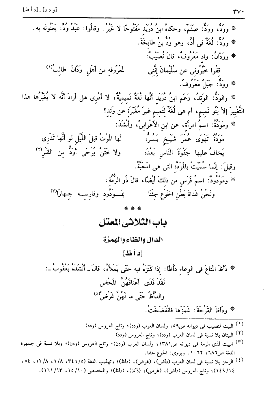 ووُدٌّ، ووَدٌّ: صَنَمٌ، وحكاهُ ابنُ دُرَيْدٍ مفْتُوحاً لا غَيْرُ: وقالُوا: عَبْدُ وُدٍّ: بَعْنُونَه به. ووُدٌّ: لُغَةُ في أُدٍّ، وهو وُدُّ بنُ طابِخَةَ. وَوَدّانُ: وادٍ مَعْرُوفٌ، قالَ نُصَيْبٌ: