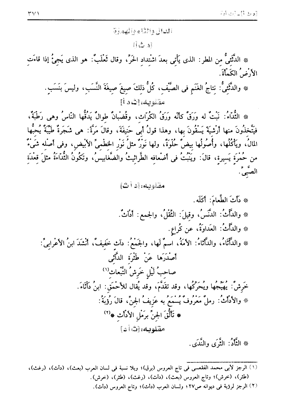 : [د أث] دَأَثَ الطَّعامَ: أَكَلَه. والدَّأْثُ: الدَّنَسُ، وقِيلَ: الثَّقْلُ، والجمع: أَدْآثٌ. والدَّأْثُ: العَداوَةُ: عن كُراعٍ. والدَّأْثَاءُ، والدَّأًَثاءُ: الأَمَةُ، اسمٌ لَها، والجَمْعُ: دآثٍ خَفِيفٌ، أَنْشَدَ ابنُ الأَعْرابِيِّ: