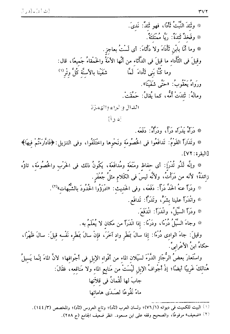 [د ر أ] دَرَأَةُ يَدْرَأه دَرْأً، ودرَّأهُ: دَفَعَه. وتَدَارَأَ القَوْمُ: تَدافَعُوا في الخُصُومَةِ ونَحْوِها واخْتَلَفُوا، وفي التنزيل: {فاداَّرَءْتُمْ فِيهَا} [البقرة: 72] . وإنَّه لَذُو تُدْرإ: أي حِفاظٍ ومَنَعَةٍ ومُدافَعَةٍ، يَكُونُ ذلك في الحَرْبِ والخُصُومَةِ، تاؤُه زِائدَةٌ، لأَنه من دَرَأْتُ، ولأَنَّه ليسَ في الكَلاِم مثلُ جَعْفَرِ. ودَرَأَ عنهُ الحَدَّ دَرْأً: دَفَعَه، وفي الحَدِيثِ: ((ادْرَؤُوا الحُدُودَ بالشُّبُهاتِ)) . وانْدَرَأَ علينا بَشَرٍّ، وتَدَرَّأَ: تَدافَع. ودَرَأ السَّيْلُ، وانْدَرَأَ: انْدَفَعَ. وجاءَ السَّيْلُ دُرْءاً، ودَرْءاً: إِذا انْدَرَأ من مَكانٍ لا يُعْلَمْ به. وقيلَ: جاءَ الوادِي دُرْءاً: إِذا سالَ بمَطَرِ وادٍ آخَرَ، فإِنْ سالَ بمَطَرِه نَفْسِه قِيلَ: سالَ ظَهْراً، حكاهُ ابنُ الأَعْرابِي. واسْتَعارَ بعضُ الرُّجّاز الدَّرْءَ لسَيَلانِ الماءِ من أَفْواهِ الإِبلِ في أَجْوافِها؛ لأنَّ الماءَ إنّما يَسيِلُ هُنالِكَ غَرِيباً أيضاً؛ إذْ أَجْوافُ الإِبلِ لَيْسَتْ من مَنابِعِ الماءِ ولا مَناقِعِه، فقَالَ: