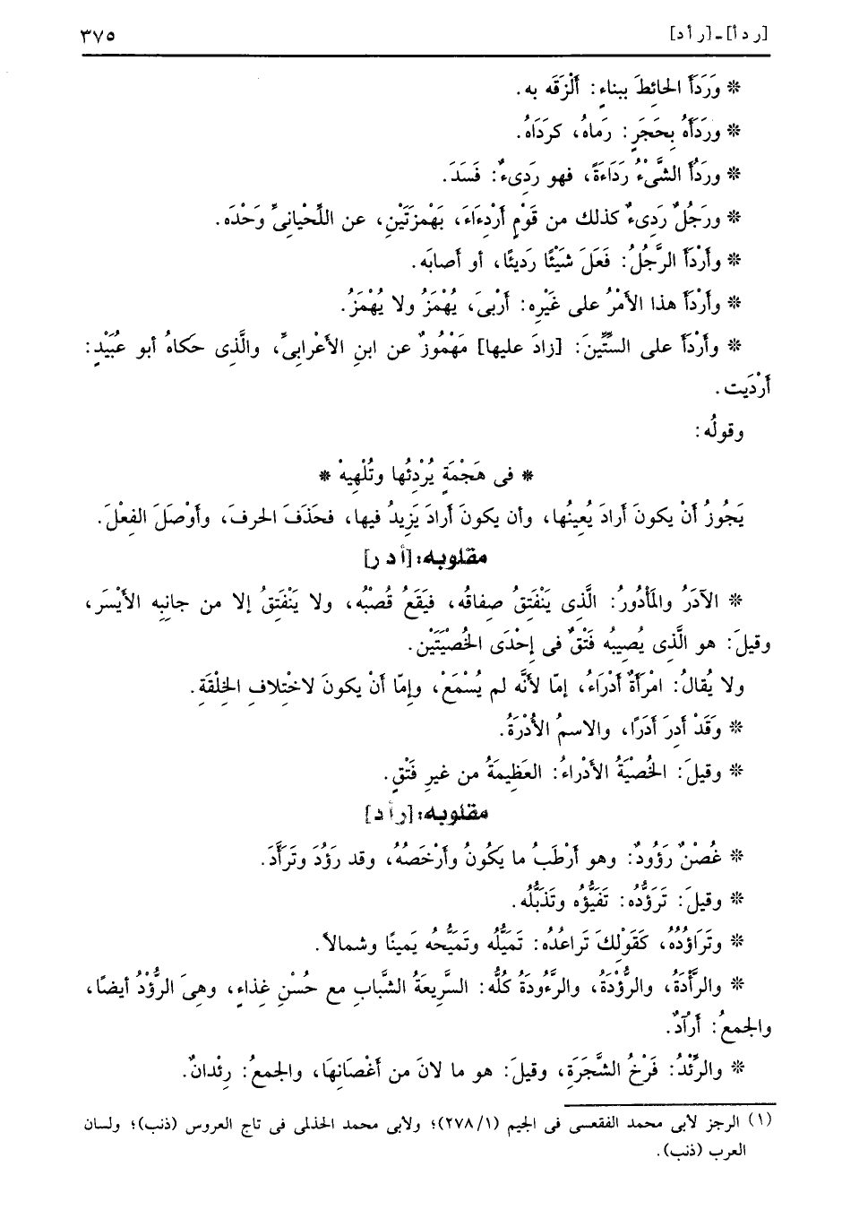وَرَدَأَ الحائِطَ ببناءٍ: أَلزَقَه به. ورَدَأَهُ بِحَجَر: رَماهُ، كَرَدَاه. ورَدُأَ الشَّيْءُ رَدَاءةُ، فهو رَدئٌ: فَسَدَ. ورَجُلٌ رَدِيءٌ كذلك من قَوْمٍ أَرْدِءَاءَ، بَهْمزَتَيْنِ، عن اللِّحْيانِيٍّ وَحْدَه. وأَرْدَأَ الرَّجُلُ: فَعَلَ شَيْئاً رَديئاً، أو أَصابَه. وأَرْدَأَ هذا الأَمْرُ على غَيْرِه: أَرْبَي، يُهْمَزُ ولا يُهْمَزُ. وأَرْدَأَ على السِّتٍِّ ينَ: [زادَ عليها] مَهْمُوزٌ عن ابنِ الأَعْرابِيٍّ، والَّذِي حَكاهُ أبو عُبَيْدٍ: أَرْدَِيت. وقولُه:
