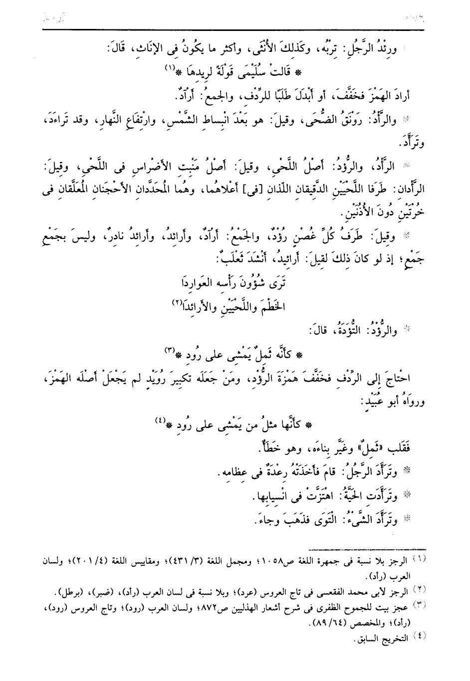أرادَ الهَمْزَ فخَفَّفَ، أو أَبْدَلَ طَلَباً للرِّدْفِ، والجمعُ: أَرْادٌ. والرَّأْدُ: رُوْنَقُ الضُّحى، وقيلَ: هو بَعْدَ انْبِساطِ الشَّمْسِ، وارِتْفَاعِ النَّهارِ، وقد تَراءَدَ، وتَرَأَدَ. الرَّاْدُ، والرُّؤدُ: أَصْلُ اللَّحْيِ، وقيلَ: أَصْلُ مَنْبِتِ الأَضْراسِ في اللَّحْيِ، وقِيلَ: الرَّأْدنِ: طَرَفا اللَّحْيَينِ الدَّقِيقانِ اللّذانِ [في] أَعْلاهُما، وهُما المُحَدَّدانِ الأَحْجَنانِ المُعَلَّقانِ في خُرْتَيْنِ دُونَ الأُذُنَيْنِ. وقِيلَ: طَرَفُ كُلِّ غُصْنٍ رُؤْدٌ، والجَمْعُ: أَرْآدٌ، وأَرائِدُ، وأَرائِدُ نادِرٌ، وليسَ بجَمْعِ جَمْعٍ؛ إذا لو كانَ ذِلكَ لقِيلَ: أَرائِيدُ، أَنْشَدَ ثَعْلَبٌ: