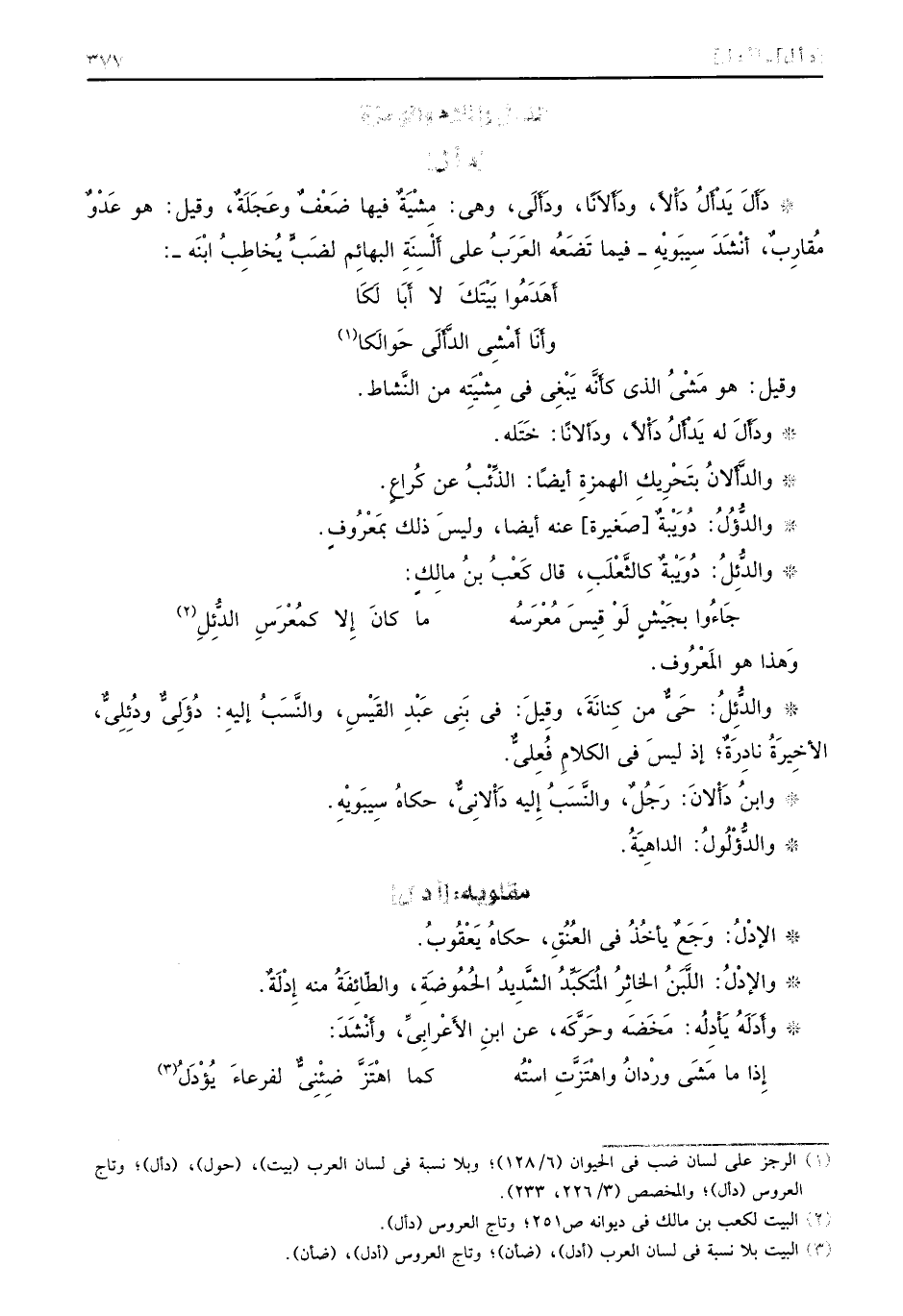 وقيل: هو مَشْيُ الذي كأَنَّه يَبْغيِ في مِشْيَتِه من النَّشاطْ ودَأَلَ له يَدْأَلُ دَأْلاً، ودَألانًا: خَتَله. والدَّأَلانُ بتَحْرِيكِ الهمزِة أيضاً: الذِّئْبُ عن كُراع. والدُّؤُلُ: دُوَيْبةٌ [صَغيرة] عنه أيضاً، وليسَ ذلك بمَعْرُوفٍ. والدُّئِلًُ: دُوَيْبةٌ كالثَّعْلَبِ، قال كَعْبُ بنُ مالِكٍ: