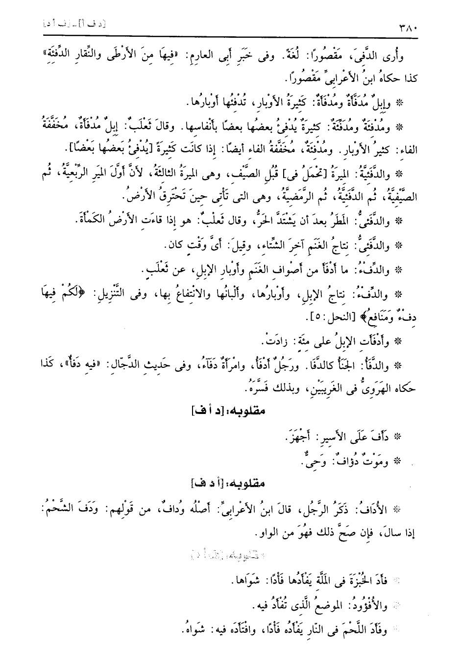 وأُرى الدَّفِيَ، مَقْصُوراً: لُغَةً. وفي خَبَرِ أَبِي العارِم: ((فيها مِنَ الأَرْطَي والنَّقارِ الدِّفِئَةِ)) كذا حكاهُ ابنُ الأَعْرابِي مَقْصُوراً. وإِبِلٌ مُدَفَّأَةٌ ومُدْفَأَةٌ: كَثِيرَةُ الأَوْبارِ، تُدْفِئُها أَوبْارُها. ومُدْفِئَةٌ ومُدَفِّئَةٌ: كثِيرَةٌ يُدْفِيءُ بَعضُها بعضاً بأَنْفاسهِا. وقالَ ثَعْلَبٌ، إِبِلٌ مُدْفَأَةٌ، مُخَفَّفَةُ الفاءِ: كثيرُ الأَوْبارِ. ومُدْفِئَةُ، مُخَفَّفَةُ الفاءِ أيضاً: إِذا كانَت كَثيِرةً [يُدْفِيءُ بَعَضُها بَعضاً] . والدَّفَئِيَّةُ: المِيرَةُ [تَحْمَلُ في] قُبُلِ الصَّيْفِ، وهي الميرَةُ الثالِثُة، لأَنَّ أَوَّلَ المَيرِ الرِّبْعِيَّةُ، ثُم الصَّيْفِيَّةُ ثُم الدَّفَئِيَّةُ، ثُم الرَّمَضَيَّةُ، وهي التي تَأْتِي حِينَ تَخْتَرقُ الأَرْضُ. والدَّفئىُّ: المطر بعد أن يشتد الحر، وقال ثعلبٌ: هو إذا قاءت الأرضُ الكمأةَ والدَّفَئيُّ: نِتاجُ الغَنَمِ آخَِرَ الشِّتاءِ، وقِيلَ: أَيَّ وَقْتٍ كانِ. والدِّفّْ: ما أَدْفَأَ من أَصْوافِ الغَنَمِ وأَوْبْارِ الإِبلِ، عن ثَعْلَبٍ. والدِّفْءُ: نِتاجُ الإِبِلِ، وأَوْبارُها، وأَلْبانُها والانْتفاعُ بِها، وفي التَّنْزِيلِ: (لَكُمْ فِيهاِ دِفٌْ ومَنَافَعُ} [النحل: 5] وأَدْفَأَتِ الإِبلُ على مئَةٍ: زادَتْ. والدَّفَأُ: الجَنَأُ كالدَّفَا. ورَجُلٌ أَدْفَأُ، وامْرَأَةُ دَفَآءُ، وفي حَدِيثِ الدَّجْالِ: ((فيهِ دَفأٌ)) كَذا حَكاه الهَرَوِيُّ في الغَرِيَبْينِ، وبذلك فَسَّرَهُ.