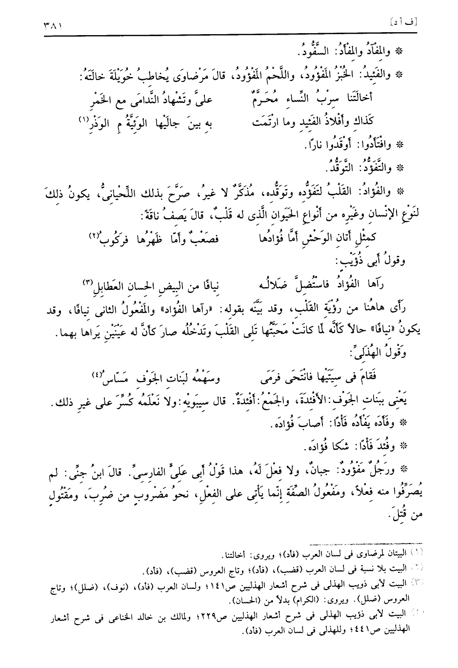 وافْتَأَِدُوا: أَوْقَدُوا ناراً. والتَّفَؤُّدُ: التَّوَقُّدُ. والفُؤادُ: القَلْبُ لَتفَؤُّدِه وتَوَقُّدِه، مُذكَّرُ لا غيرُ، صَرَّحَ بذلك اللِّحْيانِيُّ، يكونَ ذِلكَ لَنوْعِ الإنْسانِ وغَيْرِه من أَنْواعِ الحَيَوانِ الَّذِي له قَلْبٌ، قالَ يًصِفُ ناقَةً:
