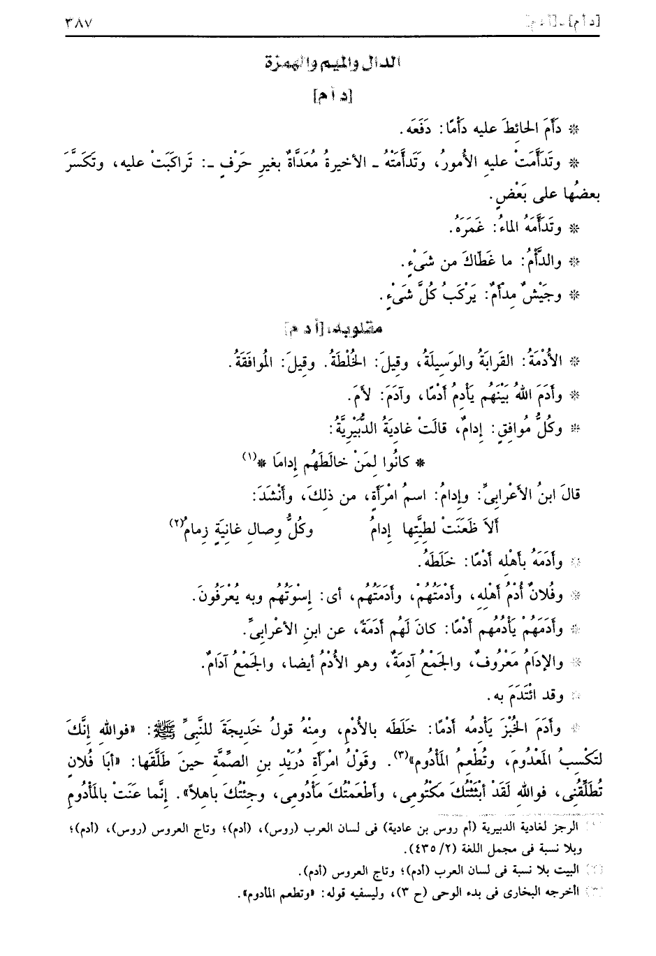 وأًَدَمَهُ بأَهْلهِ أِدْمًا: خَلَطَه. وفُلانٌ أَدمُ أَهْلِهِ، وأَدْمَتُهُمْ، وأَدَمَتُهُم، أي: إِسْوَتُهُم وبه يُعْرَفُونَ. وأًَدَمَهُمْ يَأْدُمُهم أَدْماً: كانَ لَهْم أَدَمَةً، عن ابنِ الأَعْرابِيٍّ. والإدَامُ مَعْرُوفٌ، والجَمْعُ آدِمَةٌ، وهو الأُدْمُ أيضاً، والجَمْعُ آدَامٌ. وقد ائْتَدَمَ به. وأَدَمَ الخُبْزَ يَأْدِمُه أَدْماً: خَلَطَه بالأُدْمِ، ومِنْهُ قولُ خَدِيجَةَ للنَّبِيِّ صلى الله عليه وسلم: ((فواللهِ إِنَّكَ لتَكْسِبُ المَعْدُومَ، وتَطْعِمُ الَمأْدُوم)) . وقَوْلُ أمْرًَأَةِ دُرَيْدِ بنِ الصِّمَّةِ حينَ طَلَّقَها: ((أبَا فُلانٍ تُطَلِّقُنِي، فواللهِ لَقَدْ أبْثَثْتُكَ مَكْتُومِي، وأَطْعَمْتُكَ مَأْدُومِي، وجِئْتُكَ باهِلاً)) . إِنَّما عَنَتْ بالَمأْدُومِ