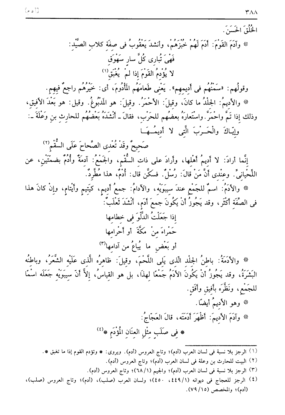 وقولُهم: ((سَمْنَهُم في أِديِمِهِم)) . يَعْنِي طَعامَهُم المَأْدُومَ، أي: خَيرُهُم راجِعٌ فِيهِمِ. والأَدِيمُ: الجِلْدُ ما كانَ، وقِيلَ: الأَحْمَرَ. وقِيلَ: هو المَدْبُوغُ. وقيل: هو بَعْدَ الأَفِيقِ، وذلك إِذا تَمَّ واحْمَرَّ. واسْتَعارَهُ بعضُهم للحَرْبِ، فقالَ - أَنْشَدَِهُ بَعْضُهمُ للحارِثِ بنِ وَعْلَةَ _: