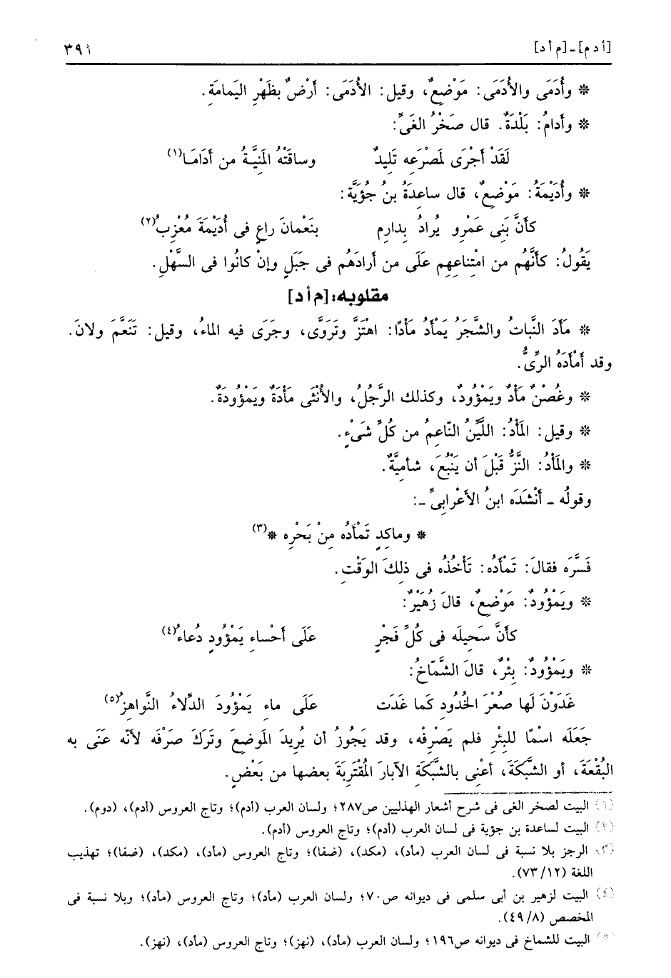 : [م أد] مَأَدَ النَّباتُ والشَّجَرُ يَمْأَدُ مَأْداً: اهْتَزَّ وتَرَوَّى، وجَرَى فيه الماءُ، وقيل: تَنَعَّمَ ولانَ. وقد أَمْأَدَهُ الرِّيُّ. وغُصْنٌ مَأْدٌ ويُمْؤُودٌ، وكذلك الرَّجُلُ، والأُنْثَى مَأْدَةٌ ويَمْؤُودَةُ. وقيل: المَأْدُ: اللَّيِّنُ النّاعِمُ من كُلِّ شَيءِْ. والمَأْدُ: النَّزُّ قَبْلَ أن يَنْبُعَ، شأمِيَّةٌ. وقولُه - أَنْشَدَه ابنُ الأَعْرابِيِّ -: