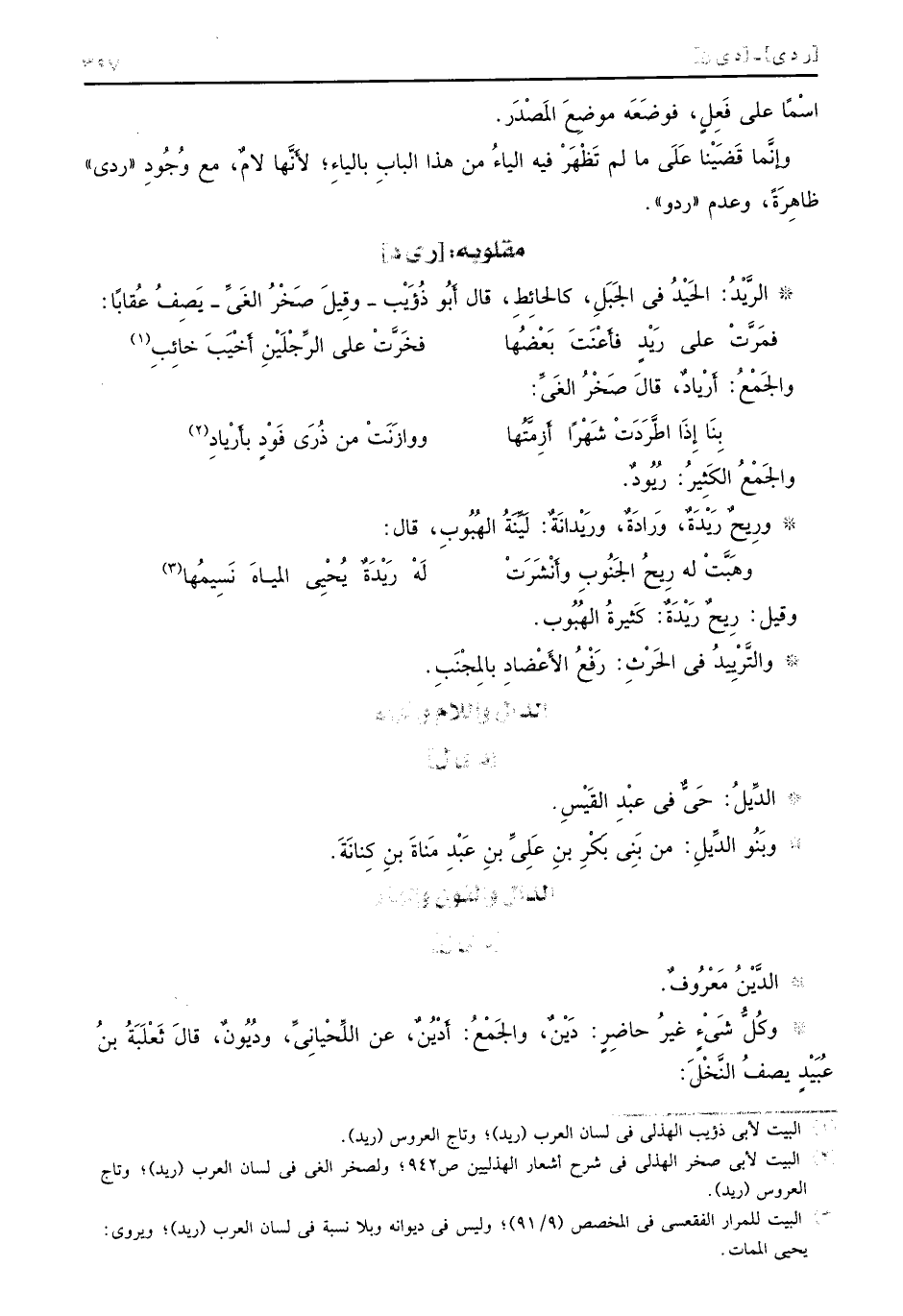 : [ر ي د] الرَّيْدُ: الحيْدُ في الجَبَلِ، كالحائِطِ، قال أَبُو ذُؤََيْب - وقِيلَ صَخْرُ الغَيِّ - يَصِفُ عُقاباً: