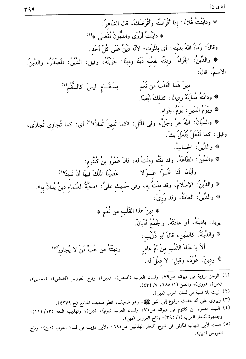 وقالَ: رَماهُ اللهُ بدَيْنِه: أي بالمَوْت؛ لأَنّه دَيْنٌ عَلَى كُلٍّ أَحِدٍ. والدِّينُ: الجَزاءُ. ودِنْتُه بِفِعِلْه دَيْناً ودِيناً: جَزَيْتُهُ، وقيل: الدَّيْنُ: المَصْدَرُ، والدِّينُ: الاسمُ، قالَ: