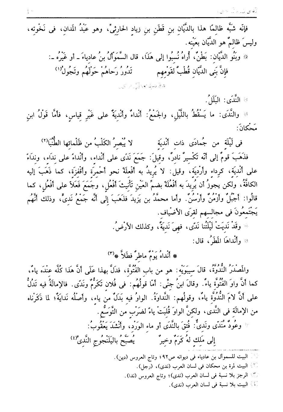 فذَهَبَ قومٌ إلى أَنّه تَكْسِيرٌ نادِرٌ، وقِيلَ: جَمَعَ نَدًى على أَنْداءٍ، وأَنْداءً على نِدَاء، ونِدَاءً على أَنْدِيَةٍ، كرِداءٍ وأَرْدِيَة، وقيل: لا يُريدُ به أَفْعَلةً نحو أَحْمرِةٍ وأَقْفِزَةٍ، كما ذَهَبَ إليه الكافَّةُ، ولكن يجوزُ أن يُريدَ به أَفْعُلَةً بضمِّ العَيْنِ تَأْنِيثَ أَفْعُلِ، وجَمَعَ فَعَلاً على أَفْعُلٍ، كما قالُوا: أَجْبُلٌ وأَزْمُنٌ وأَرْسُنٌ. وأَما محمَّدُ بن يَزيدَ فدَهَبَ إِلى أَنَّه جَمْعُ نَدِىٍّ، وذلك أَنًّهُم يَجْتَمِعُون في مجالِسِهم لِقَرَى الأَضْيافِ. وقَدْ نَدِيَتْ لَيْلَتُنا نَدًى، فهِى نَدِيَةٌ، وكذلك الأَرْضُ. وأَنْداهَا المَطَرُ، قال: