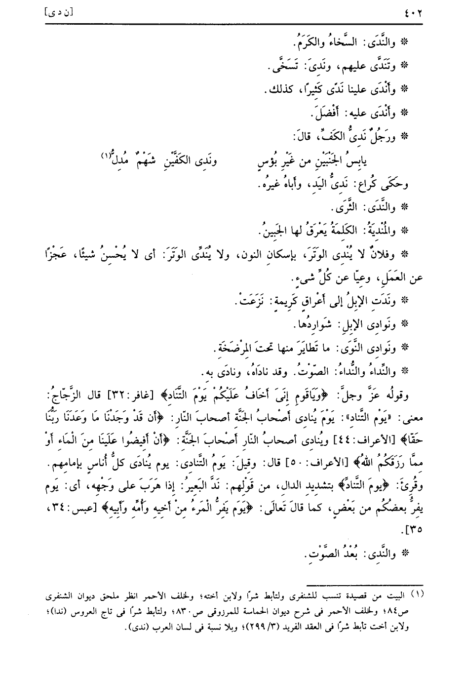 وحَكَى كُراع: نَدِىُّ اليَدِ، وأَباهُ غيرهُ. والنَّدَى: الثَّرَى. والمُنْدِيَةُ: الكَلِمَةُ يِعْرَقُ لها الجَبِينُ. وفلانٌ لا يُنْدِى الوَتَرَ، بإسكانِ النون، ولا يُنَدِّى الوَتَرَ: أي لا يُحْسِنُ شيئاً، عَجْزاً عن العَمَلِ، وعِياّ عن كُلِّ شيءْ. ونَدَتِ الإِبلُ إلى أَعْراقٍ كَرِيمةٍ: نَزَعَتْ. ونَوادِى الإبِل: شَوارَدُها. ونَوادِى النَّوَى: ما تَطايَرَ منها تحتَ المِرْضَخَةِ. والنِّداءُ والنُّداءُ: الصّوْتُ. وقد نادَاهُ، ونادَى بهِ. وقولُه عَزَّ وجلَّ: {وَيَاقَومِ إِنَىَ أَخاَفُ عَلَيْكُمْ يَوْمَ التَّنَادِ} [غافر: 32] قال الزَّجّاجُ: معنى: ((يَومْ التَّنادِ)) : يَوْمَ يُنادى أَصْحابُ الجَنَّةَ أصحابَ النّارِ: {أن قد وجدنا ما وعدنا ربنا حقا} [الأعراف: 44] ويُنادِى أصحابُ النّارِ أَِصْحابَ الجَنَّةِ: {أن أفيضوا علينا من الماء أو مما رزقكم الله} [الأعراف: 50] قال: وقِيلَ: يَوُم التَّنادِى: يوم يُنادَى كلُّ أُناسٍ بإمامِهم. وقُرئَ: {يوم التناد} بتشدِيدِ الدالِ، من قَوْلِهم: نَد البَعِيرُ: إِذا هَرَبَ على وَجْهِه، أي: يَوم يِفرُّ بعضُكُم من بَعْضٍ، كما قالَ تَعالَى: {يوم يفر المرء من أخيه وأمه وأبيه} [عبس: 34، 35] . والندَِّى: بُعْدُ الصَّوْتِ.