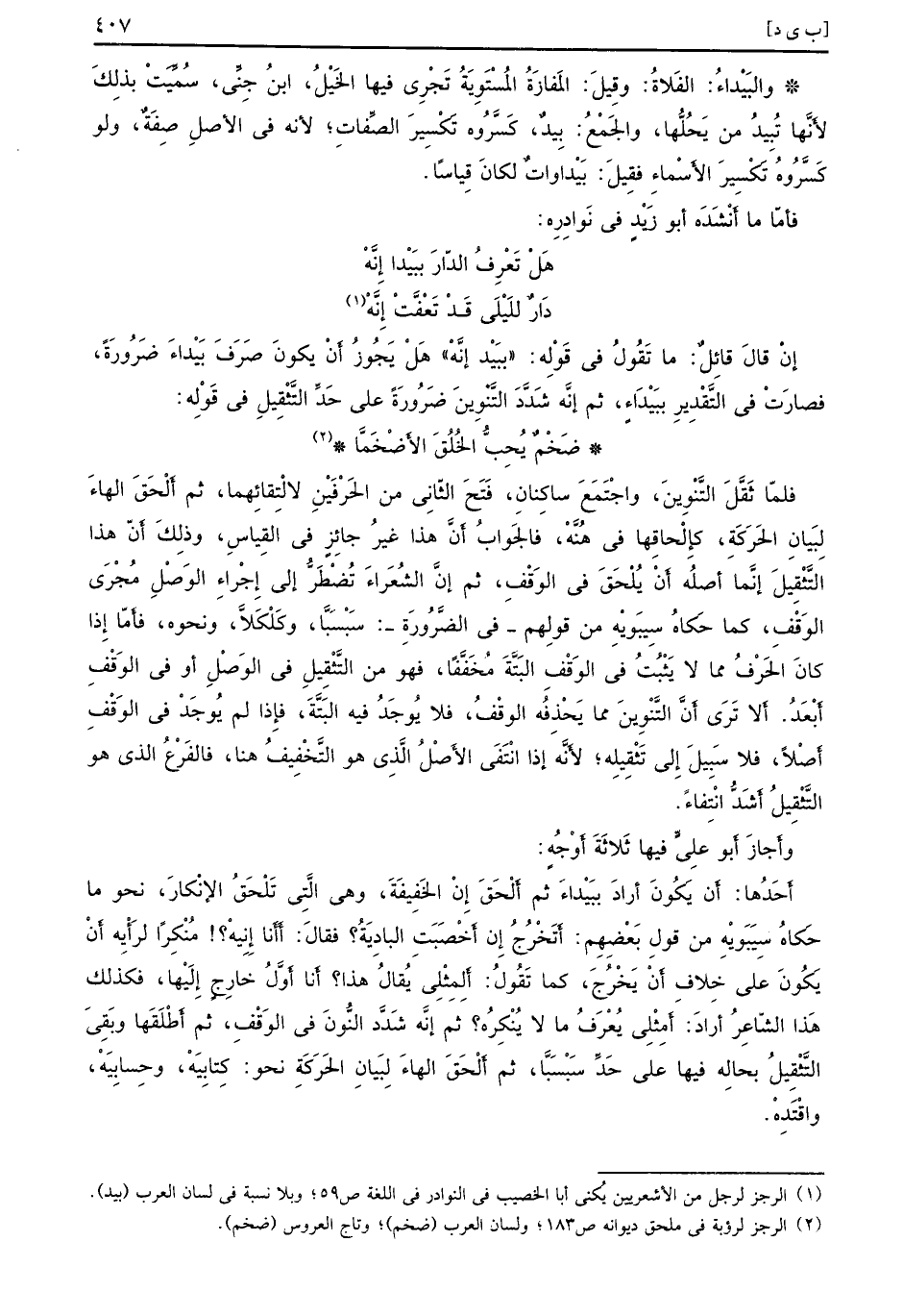 فلمّا ثَقَّلَ التَّنْوِينَ، واجَتْمَعَ ساكِنانِ، فَتَحَ الثّانِي من الحَرْفَيْنِ لالْتقائهما، ثم أَلْحَقَ الهاءَ لِبيَانِ الحَرَكَة، كإِلْحاقها في هُنَّهْ، فالجَوابُ أَنَّ هذا غيرُ جائِزٍ في القياسِ، وذِلك أَن هذا التَّثْقِيلََ إنَّما أصلُه أَنْ يُلْحَقَ في الوَقْفِ، ثم إنَّ الشُعَراءَ تُضْطَرُّ إلى إِجْراءِ الوَصْلِ مُجْرَى الوَقْفِ، كما حَكاهُ سِيبَويْهِ من قولهم _ في الضَّرُورِةَ _: سَبْسَباَّ، وكَلْكَلاَّ، ونحوه، فأَمّا إذا كانَ الحَرْفُ مما لا يَثْبتُ في الوَقْفِ البَتَّةَ مُخَفَّفّا، فهو من التّثَقْيِلِ في الوَصْلِ أو في الوَقْفِ أَبْعَدُ، أَلا تَرَى أنَّ التَّنْويِنَ مما يَحْذِفُه الوقْف، فلا يُوجَدُ فيه البَتَّة، فإِذا لم يُوجَدْ في الوَقْفِ أصْلاً، فلا سَبِيلَ إِلى تَثْقِيلِه؛ لأَنَّه إذا انتفى الأَصْلُ الَّذِي هو التَّخْفيِفُ هنا، فالفَزْعُ الذي هو التَّثْقِيلُ أَشَدُّ انْتَفاءً. وأَجازَ أَبو علِيَّ فيها ثَلاثَةَ أَوْجُهٍ: أَحَدُها: أَن يَكُونَ أرادَ بَبيْداءَ ثم أَلْحَقَ إِنْ الخَفيِفَةَ، وهي الَّتِي تَلْحَقُ الإنْكارَ، نحو ما حَكاهُ سِيَبَويْهِ من قول بَعْضِهِم: أَتْخْرُجُ إِن أَخْصَبَتِ البادِيَةُ؟ فقالَ: أَأَنا إَِنيهْ؟ مُنْكِراً لرَأْيِه أَنْ يَكُونَ على خِلاف أَنْ يَخْرُجَ، كما تَقُولُ: أَلمِثْلِي يُقالُ هذا؟ أَنا أَوَّلُ خارِجٍ إِلَيْها، فكذلك هَذا الشّاعِرُ أرادَ: أَمِثْلِى يَعْرَفُ ما لا يُنْكِرُه؟ ثم إنَّه شَدَّد النُّونَ في الوَقْفِ، ثم أَطْلَقَها وبَقَىَ التَّثْقِيلُ بحالِه فيها على حَدِّ سَبْسبَاً، ثم أَلْحَقَ الهاءَ لبِيَانِ الحَرَكَةِ نحو: كِتابِيَهْ، وحِسابِيَهْ، واقْتَدِه.
