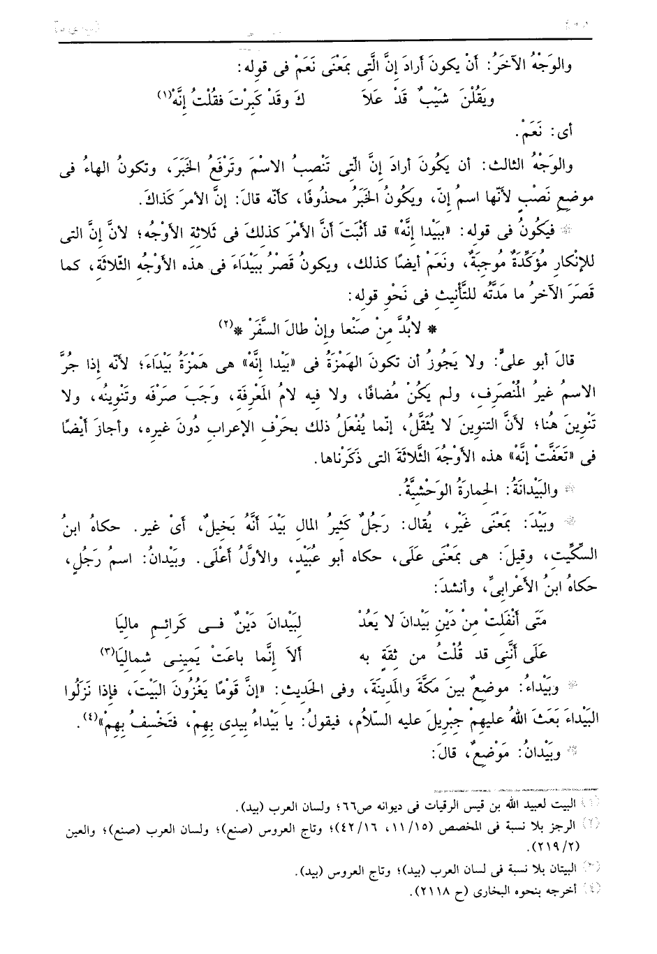 أي: نَعَمْ. والوَجْهُ الثالث: أن يَكُونَ أرادَ إِنَّ الّتِي تَنْصبُ الاسْمَ وتَرْفَعُ الخَبَرَ، وتكونُ الهاءُ في موضِعِ نَصْبٍ لأنّها اسمُ إِنّ، ويَكُونُ الخَبَرُ محذُوفًا، كأَنّه قالَ: إنَّ الأمرَ كَذاكَ. فيكُونُ في قوِله: ((ببَيْدا إِنَّهْ)) قد أَثْبَتَ أَنَّ الأمْرَ كذلِكِ في ثَلاِثهِ الأوْجُه؛ لأنَّ إِنَّ التي للإنْكارِ مُؤَكِّدَةٌ مُوجِبَةٌ، ونَعَمْ أيضاً كذلك، ويكونُ قَصْرُ بَبْيدَاءَ في هذه الأَوْجَهِ الثّلاثَةِ، كما قَصَرَ الآخُر ما مَدَّتُه للتَّأْنِيثِ في نَحْوِ قوِله: