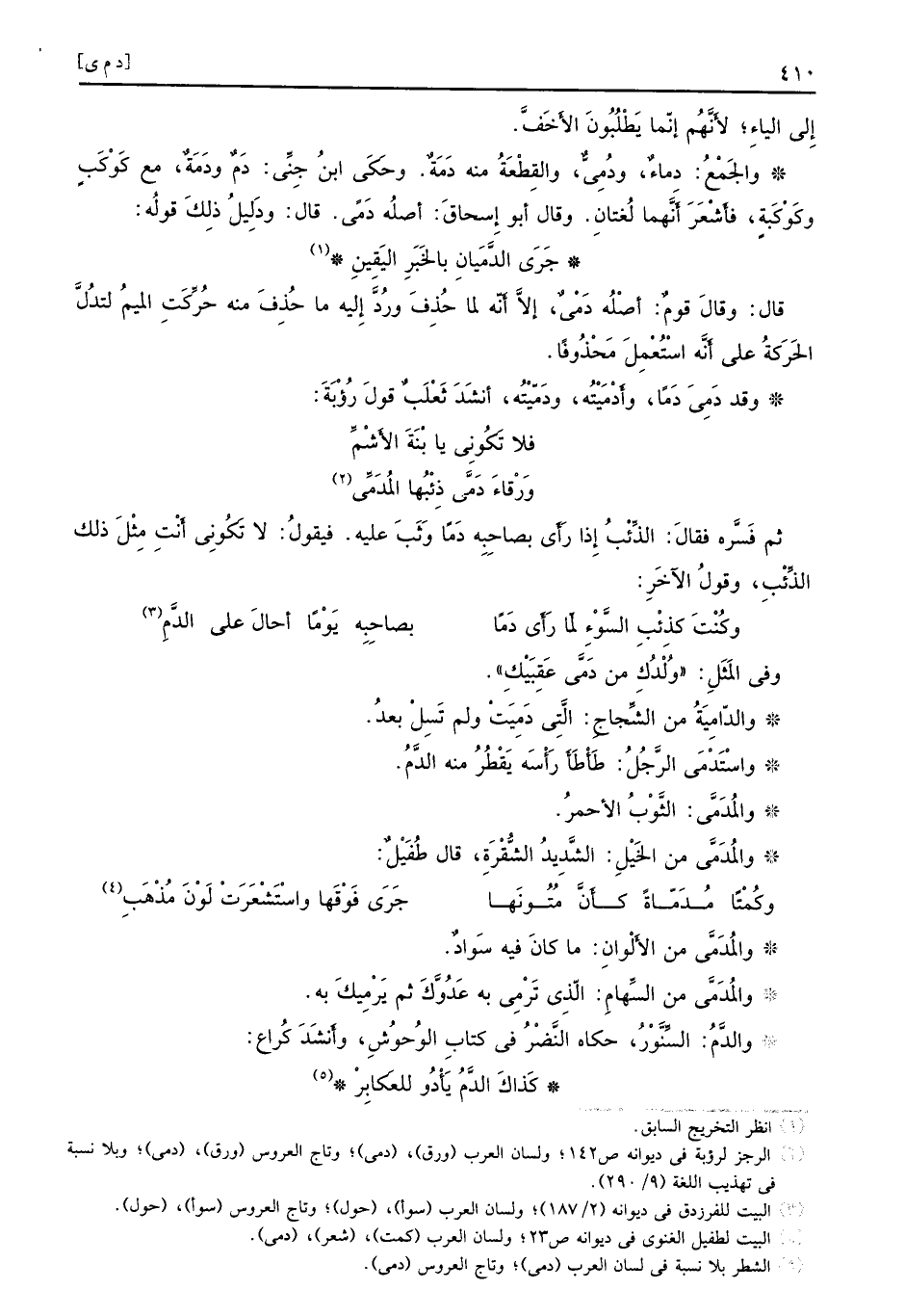 قال: وقالَ قومٌ: أًصْلُه دَمْىٌ، إلاَّ أنه لما حُذِف ورُدَّ إِليه ما حُذِفَ منه حُرِّكَتِ الميمُ لتدُلَّ الحَركَةُ على أَنَّه اسْتُعْمِلَ مَحْذُوفاً. وقد دَمَىَ دَمًا، وأَدْمَيْتُه، أنشَدَ ثَعْلَبٌ قولَ رُؤْبَةَ: