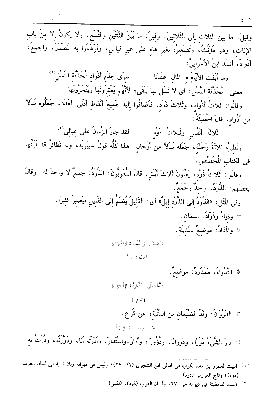 ونَظِيرُه ثلاثَةُ رَجْلَةٍ، جَعَله بَدَلاً من أَرْجالٍ. هذا كُلُّه قولُ سيبَويْهِ، وله نَظائرُ قد أَبَنتْها في الكتابِ المُخَصَّصِ. وقالُوا: ثَلاثُ ذَوْدٍ: يَعْنُونَ ثَلاثَ أَيْنُقٍ. قالَ اللُّغَويُّونَ: الذَّوْدُ: جمعٌ لا واحِدَ له. وقالَ بعضُهم: الذَّوْدُ، واحِدٌ وجَمْعٌ. وفي المَثَل: ((الذَّوْدُ إِلى الذَّوْدِ إِبِلٌ)) أي: القَلِيلُ يُضَمُّ إِلى القَلِيلِ فَيصِيرُ كِثيراً. وذِيادٌ وذَوّداٌ: اسْمانِ. والمَذادُ: موضٍِ عٌ بالمَدِينَةِ.