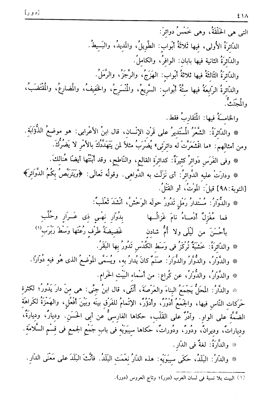 التي هي الَحَلْقَةُ، وهي خَمْسُ دوائِرَ: الدّائِرَةُ الأُولى، فِيها ثَلاثَةُ أَبْوابٍ: الطَّوِيلُ، والَمدِيدُ، والبَسِيطُ. والدّائِرَةُ الثانية فيها بابانِ: الوافِرُ، والكامِلُ. والدّائِرَةُ الثّالثَةُ فيها ثلاثُه أَبوابٍ: الهَزَجُ، والرَّجَزُ، والرَّمَلُ. والدّائِرةُ الرّابِعَةُ فيها سِتَّةُ أَبْوابٍ: السَّرِيعُ، والمُنْسَرِحُ، والخَفِيفُ، والمُضارِعُ، والمُقْتَضَبُ، والمُجْتَثُّ. والخامِسَةُ فيها: المْتَقارِبُ فقط. والدّائِرَةُ: الشَّعْرُ المُسْتَديِرُ على قَرْنِ الإنْسانِ، قال ابنُ الأَعْرابي: هو موضِعُ الذُّؤَاَبَةِ. ومن أمثالِهم: ((ما اقْشَعَرَّتْ له دائِرَتي)) يُضْرِبُ مثلاً لمن يَتَهَدَّدُكَ بالأَمْرِ لا يَضُرُّكَ. وفي الفَرَسِ دَوائِرُ كثِيرَةٌ: كدائِرِةَ القالِعِ، والنّاطِحِ، وقد أَبَنْتُها أيضاً هُنالِكَ. ودارَتْ عليهِ الدَّوائِرُ: أي نَزَلَت به الدَّواهِي. وقولُه تَعالَى: {ويتربص بكم الدوائر} [التوبة: 98] قيلَ: المَوْتُ، أو القَتْلُ. والدُّوّارُ: مُسْتدارُ رَمْلٍ تَدُورُ حولَه الوَحْشُ، أنْشَدَ ثَعْلَبٌ.