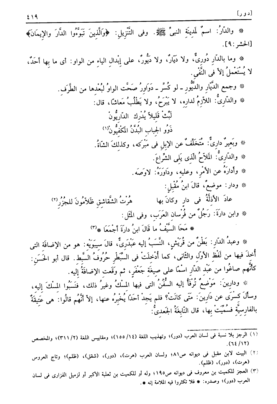 والدّارُ: اسمٌ لمَديَنَة النبِّي صلى الله عليه وسلم. وفي التَّنْزِيلِ: {وَالَّذِينَ تَبَوَّءُوا الدَّارَ والإِيمَانَ} [الحشر: 9] . وما بالدّارِ دُورِيٌّ، ولا دَيّارٌ، ولا دَيٌّ ورٌ، على إِبْدالِ الياءِ من الواو: أي ما بِها أَحَدٌ. لا يُسْتَعَملُ إلاَ في النَّفْيِ. وجمع الدَّيّارِ والدَّيُّورِ - لو كُسِّر - دَوَاوِرُ صَحَّت الواوُ لبُعْدِها من الطَّرَفِ. والدّارِيُّ: اللاّزِمُ لدارِهِ، لا يَبْرَحُ، ولا يَطْلُبُ مَعاشاً، قال: