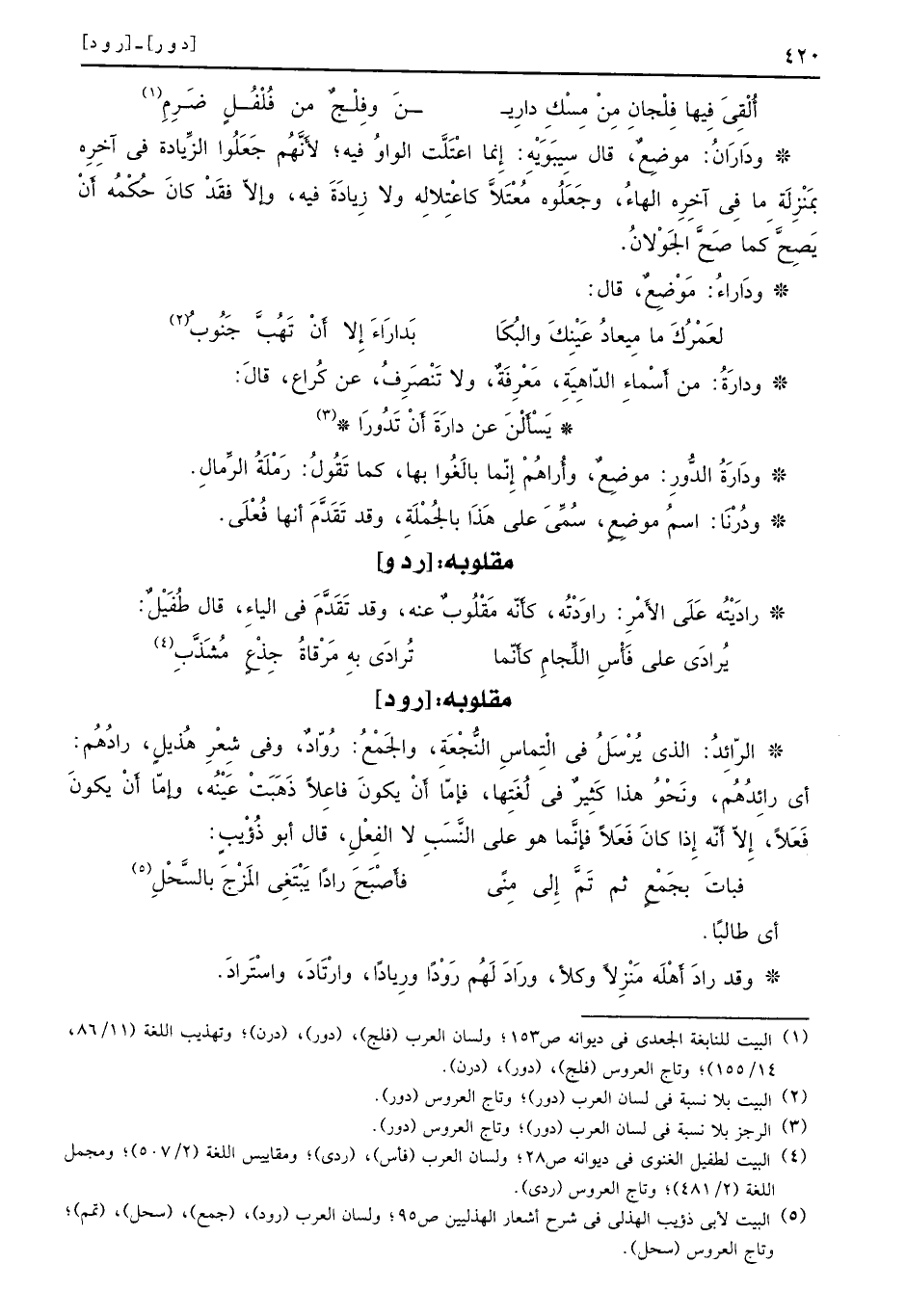 : [ر ود] الرّائِدُ: الذي يُرْسَلُ في الْتِماسِ النُّجْعَةِ، والجَمْعُ: رُوّادٌ، وفي شِعْرِ هُذيلٍ: رادُهُم: أي رائِدُهُم، ونَحْوُ هذا كَثِيرٌ في لَغَتِها، فإمّا أَنْ يكونَ فاعِلاًٍ ذَهَبَتْ عَيْنُه، وإمّا أَنْ يكونَ فَعَلاً، إِلاّ أَنّه إذا كانَ فَعَلاً فإنَّما هو على النَّسَبِ لا الفِعْلِ، قال أبو ذُؤْيبٍ: