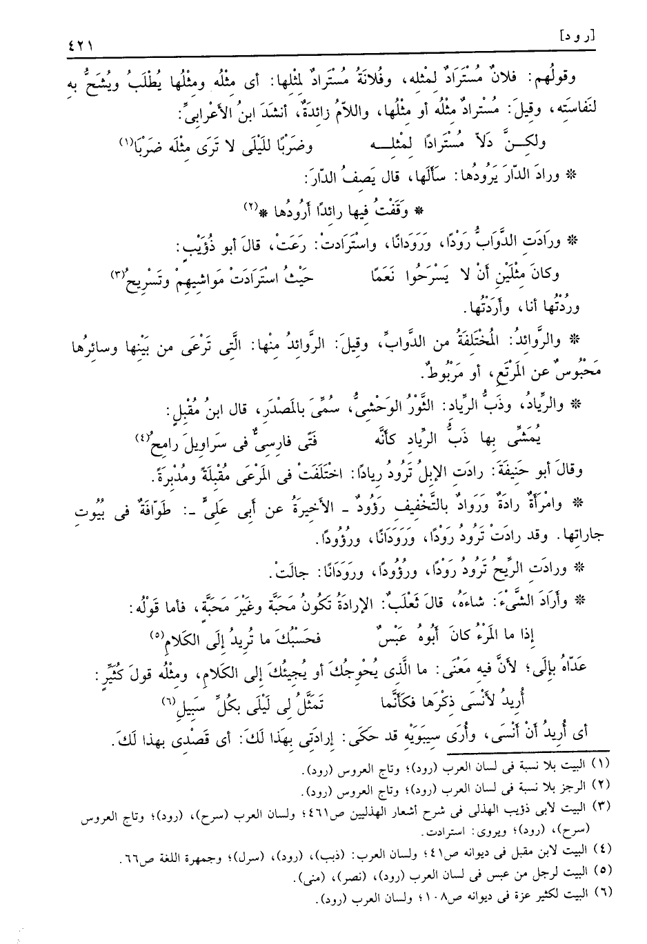 وقالَ أبو حَنيفَةَ: رادَتِ الإِبلُ تَرْدوُ رِياداً: اخْتَلَفَتْ في المَرْعَى مُقْبِلَةً ومَدْبِرَةً. وأمْرَأَةُ رادَةٌ وَرَوادٌ بالتَّخْفِيف رَؤُودٌ - الأَخِيرَةُ عن أَبِى عَلِيٍّ -: طَوّافَةٌ في بُيُوتِ جاراتِها. وقد رادَتْ تَرُودُ رَوْداً، وَرَوَدَانًا، ورُؤوداً. ورادَت الرِّيحُ تَرُودُ رَوْداً، ورُؤُوداً، ورَوَدَانًا: جالَتْ. وأَرَادَ الشَّيْءَ: شاءةُ، قالَ ثَعْلَبٌ: الإرادةُ تَكُونُ مَحَبَّة وغَيْرَ مَحَبَّةٍ، فأما قَوْلُه: