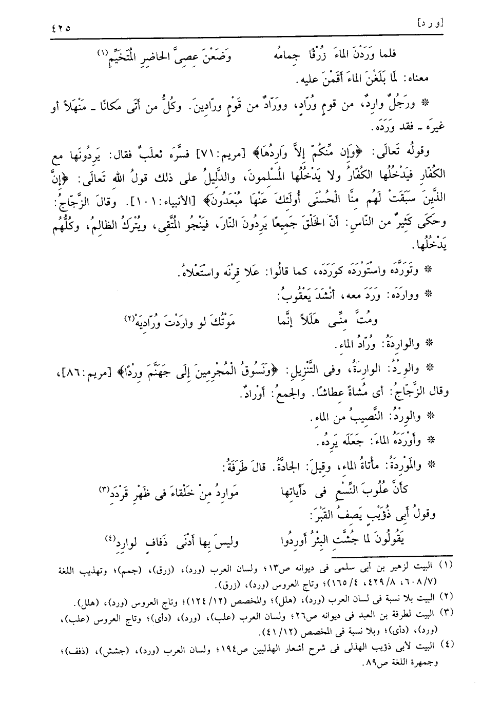 معناه: لَما يَلَغْنَ الماءَ أَقَمْنَ عليه. ورَجُلٌ وارِدٌ، من قومٍ وُرّادٍ، ووَرّادٌ من قَوْمٍ ورّادِينَ. وكُلُّ من أَتَى مَكانًا _ مُنْهَلاً أو غيرَه - فقد وَرَدَه. وقولُه تَعالَى: {وإن منكم إلا واردها} [مريم: 71] فسَّرَه ثعَلٌ ب فقال: يَرِدُونَها مع الكُفّارِ فيَدْخُلُها الكفار ولايدخلها الُمسْلِمونَ، والدَّلِيلُ على ذلك قولُ الله تَعالَى: {إن الذين سبقت لهم منا الحسنى أولئك عنها مبعدون} [الأنبياء: 101] . وقالَ الزَّجّاجُ: وحَكَى كَثِيرٌ من النّاسَِ: أََنّ الخَلْقَ جَمِيعاً يَرْدُونَ النّارَ، فَينْجُو المُتَّقِى، ويُتْرَكُ الظالِمُ، وكُلُّهُم يَدْخُلُها. وتَوَرَّدَه واسْتَوْرَدَه كوَردَه، كما قالُوا: عَلا قِرْنَه واسْتَعْلاهُ. ووارَدَه، وَرَدَ معه، أنْشَدَ يَعْقُوبُ: