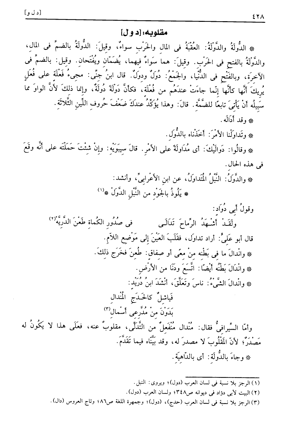 : [د ول] الدًُّولَةُ والدَّوْلَةُ: العُقْبَةُ في المالِ والحَرْبِ سواءٌ، وقِيلَ: الدُّولَةُ بالضمِّ في المالِ، والدًّوْلَةُ بالفتحِ في الحَرْبِ. وقِيلَ: هما سَواءٌ فِيهما، يَضَمّان ويُفْتَحانِ. وقِيلَ: بالضِّمِّ في الآخِرةَ، وبالفَتْحِ في الدُّنْيا، والجَمْعُ: دُوَلٌ ودوَلٌ. قال ابنُ جِنِّى: مجىءُ فَعْلَةٍ على فُعَلِ يُرِيكَ أَنَّها كأَنَّها إِنّما جاءَتْ عندَهُم من فُعْلَةٍ، فكأَنَّ دَوْلَةً دُوَلَةٌ، وإِنما ذلكَ لأَنَّ الواوَ مما سَبِيلُه أَنْ يَأْتِىَ تابعاً للضًّمَّةِ. قالَ: وهذا يُؤكِّدَ عندَكَ ضَعْفَ حُروفِ اللِّينِ الثَّلاثَةِ. وقد أَدَالَه. وتَداوَلْنا الأَمْرَ: أَخَدْناه بالدُّوَلِ. وقالُوا: دَوالَيْكَ: أي مُدَاولَةً على الأَمْرِ. قالَ سَيِبَويْهَْ: وإِنْ شِئْتَ حَمَلْتَه على أَنَّه وقَعَ في هذه الحالِ. والدَّوَلُ: النَّبْلُ المُتَداوَلُ: عن ابنِ الأَعْرابِىِّ، وأنشد: