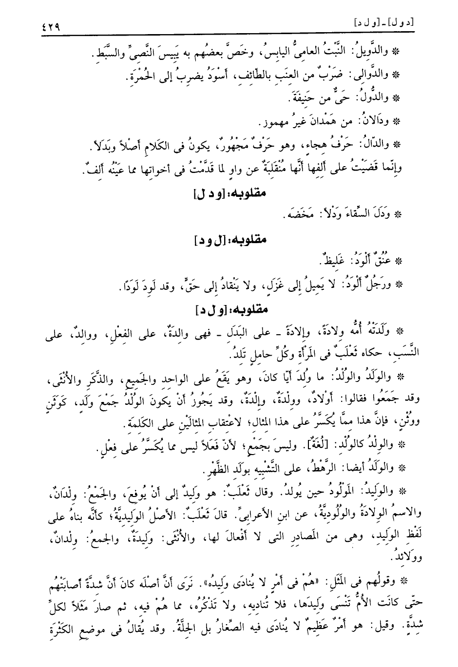 : [ول د] وَلَدَتْهُ أُمُّه وِلادَةً، وإِلادَةً _ على البَدَلِ - فهي والِدَةٌ، على الفِعْلِ، ووالِدٌ، على النَّسَبِ، حكاه ثَعْلَبٌ في المَرْاَةِ وكُلِّ حامِلٍ تَلدُ. والوَلَدُ والوُلْدُ: ما وَلِدَ أَيّا كانَ، وهو يَقَعُ على الواحِدِ والجَمِيعِ، والذَّكَرِ والأُنْثَى، وقد جَمَعُوا فقالوا: أَوْلادٌ، ووِلْدَةٌ، وإِلْدَةُ، وقد يَجُوزُ أَنْ يكونَ الوُلْدُ جَمْعَ وَلِدٍ، كَوَثَنٍ ووثُنٍ، فإنَّ هذا مِماَّ يَكَسَّرُ على هذا المَثالِ؛ لاعْتَقاب المِثالَيْنِ على الكِلَمَة. والوِلْدُ كالوُلْدِ: [لُغَةُ] . وليسَ بجَمعٍ؛ لأَنّ فَعَلاً ليس مما يُكَسَّرُ على فِعْلٍ. والوَلَدُ أيضا: الرَّهْطُ، على التَّشْبِيهِ بوَلَدِ الظَّهْرِ. والوَلِيدُ: المَوْلُودُ حين يُولُد. وقال ثَعْلَبٌ: هو وَلِيدٌ إلى أَنْ يُوفِعَ، والجَمْعُ: وِلْدَانٌ، والاسمُ الوِلادَةُ والوُلُودِيَّةُ، عن ابنِ الأَعرابِيِّ. قالَ ثَعْلَبٌ: الأَصْلُ الوَلِيدِيَّةُ؛ كأَنَّه بناهُ على لَفظْ الوِلَيِدِ، وهي من المَصادِرِ التي لا أَفْعالَ لها، والأُنْثَى: وَلِيدَةٌ، والجمعُ: وِلْدانٌ، ووَلاِئدُ. وقولُهم في المَثَلِ: ((هُمْ في أَمْرِ لا يُنادَى وَلِيدهُ)) . نَرَى أَنَّ أصْلَه كانَ أَنَّ شِدَّةً أصابَتُهم حتّى كانَت الأُمُّ تَنْسَى وَلِيدَها، فلا تُنادِيِه، ولا تَذْكُرُه، مما هُمْ فيهِ، ثم صارَ مَثَلاً لكلِّ شِدَِةَّ، وقيل: هو أَمْرٌ عَظِيمٌ لا يُنادَى فيه الصِّغارُ بل الجِلَّةَ. وقد يُقالُ في موضِعِ الكَثْرِةِ