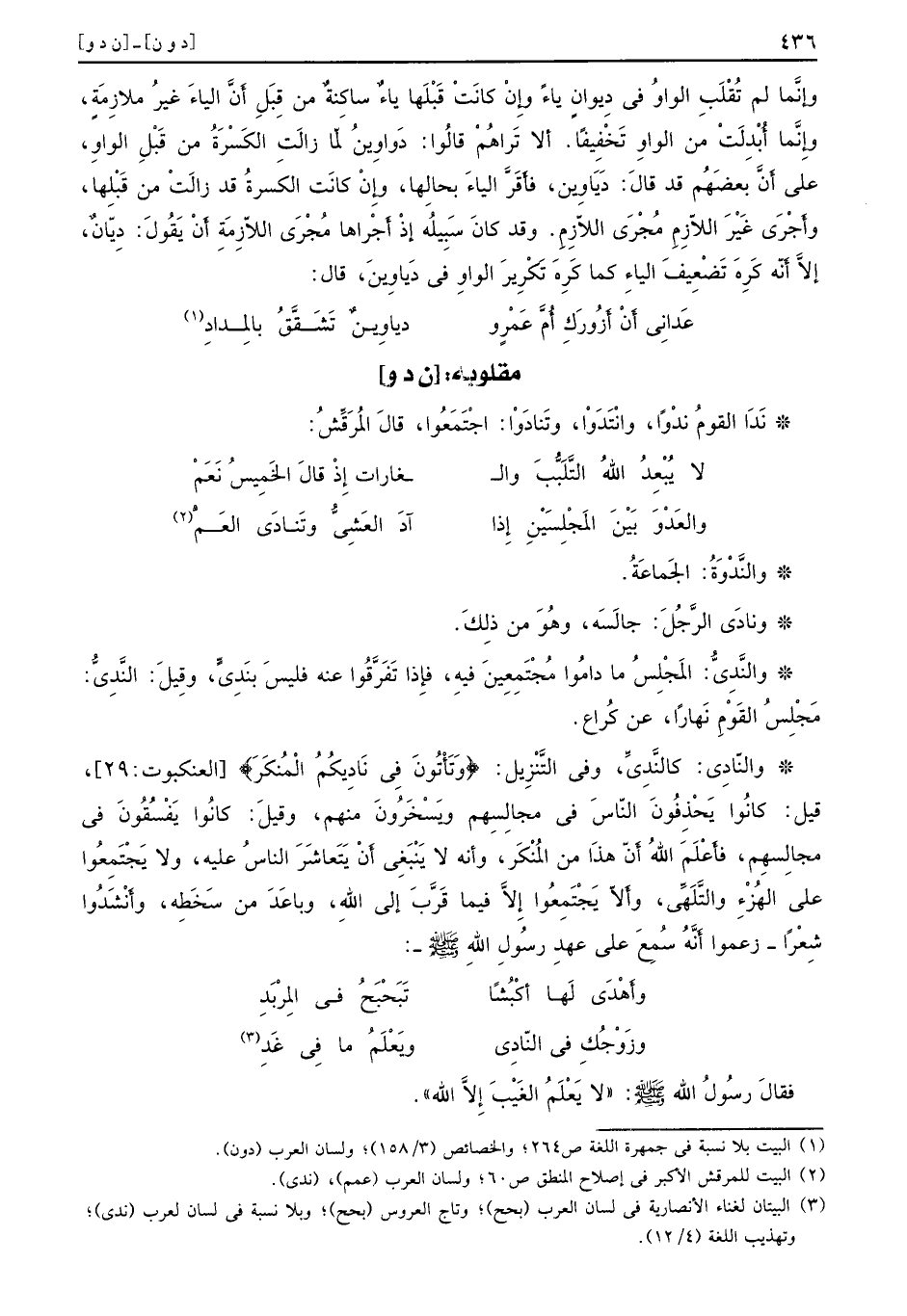 والنَّدْوَةُ: الجَماعَةُ. ونادَى الرَّجُلَ: جالَسَه، وهُوَ من ذِلكَ. والِنَّدىُّ: المَجْلِسُ ما دامُوا مُجْتَمعِينَ فيهِ، فإِذا تَفَرَّفُوا عنه فليسَ بنَدِىٍّ، وقِيلَ: النَّدِىُّ: مَجْلِسُ القَوْمِ نَهاراً، عن كُراع. والنّادِى: كالنَّدِىِّ، وفي التَّنْزِيل: {وَتَأْتُونَ فِي نَادِيكُمُ المْنُكَرَ} [العنكبوت: 29] ، قيل: كانُوا يَحْذِفُونَ النّاس في مجالِسِهم ويَسْخَرُونَ منهم، وقيلَ: كانُوا يَفْسُقُون في مجالِسهِم، فأَعْلَمَ اللهُ أَنّ هذَا من المُنْكَر، وأنه لا يَنْبَغِى أَنْ يَتَعاشَرَ الناسُ عليه، ولا يَجْتَمِعُوا على الهُزْءِ والتَّلَهِّى، وأَلاّ يَجْتَمِعُوا إِلاَّ فيما قَرَّبَ إلى الله وباعَدَ من سَخَطِه، وأَنْشَدُوا شِعْراً - زعموا أَنَّهُ سُمْعَ على عهدِ رسُولِ اللهِ صلى الله عليه وسلم -: