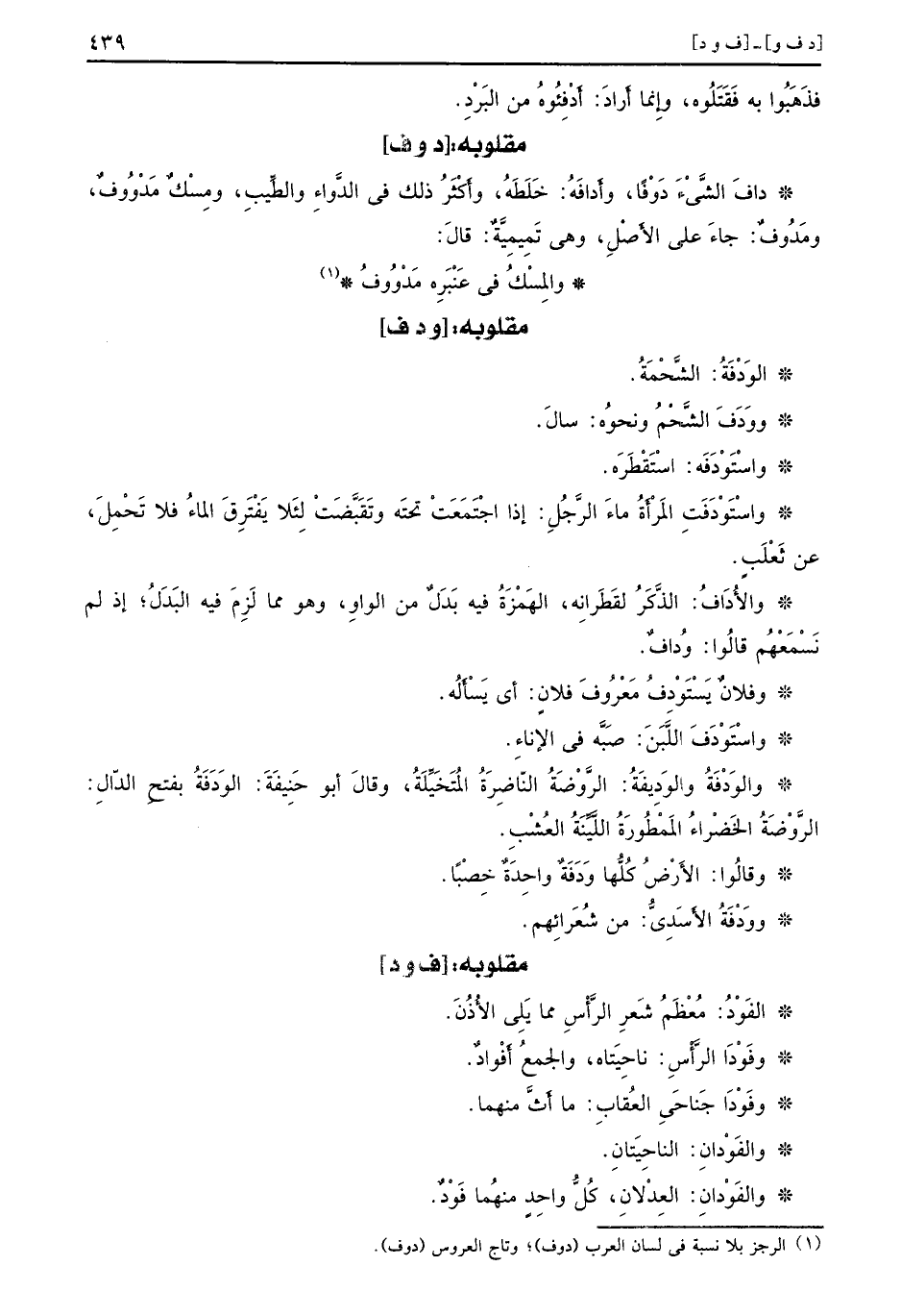 [ود ف] الوَدْفَةُ: الشَّحْمَةُ. ووَدَفَ الشَّحْمُ ونحوهُ: سالَ. واسْتَوْدَفَة: اسْتَقْطَرَه. واسْتَودَفَتِ المَرْأَهُ ماءَ الرَّجُلِ: إذا اجْتَمَعَتْ تحتَه وتَقَبَّضَتْ لِئلاَ يفْتَرِقَ الماءُ فلا تَحْمِلَ، عن ثَعْلَبٍ. والأُدَافُ: الذَّكًَرُ لَقَطَرانِه، الهَمْزَةُ فيه بَدَلٌ من الواوِ، وهو مما لَزِمَ فيه البَدَلُ؛ إذ لم نَسْمَعْهُم قالُوا: وُدافٌ. وفلانٌ يَسْتَوْدِفُ مَعْرُوفَ فلانٍ: أي يَسْأَلُه. واسْتَودَفَ اللَّبَنَ: صَبَّه في الإناءِ. والوَدْفَةُ والوَدِيفَةُ: الرَّوْضَةُ النّاضِرَةُ الُمتَخَيِّلَةُ، وقالَ أبو حَنِيفَةَ: الوَدَفَةُ بفتحِ الدّالِ: الرَّوْضَةُ الخَضْراءُ المُمْطُورَةُ اللِّيِّنَةُ العُشْبِ. وقالوُا: الأَرْضُ كُلُّها وَدَفَةُ واحِدَةٌ خِصْباً. ووَدْفَةُ الأَسَدِيُّ: من شُعْرائِهم.