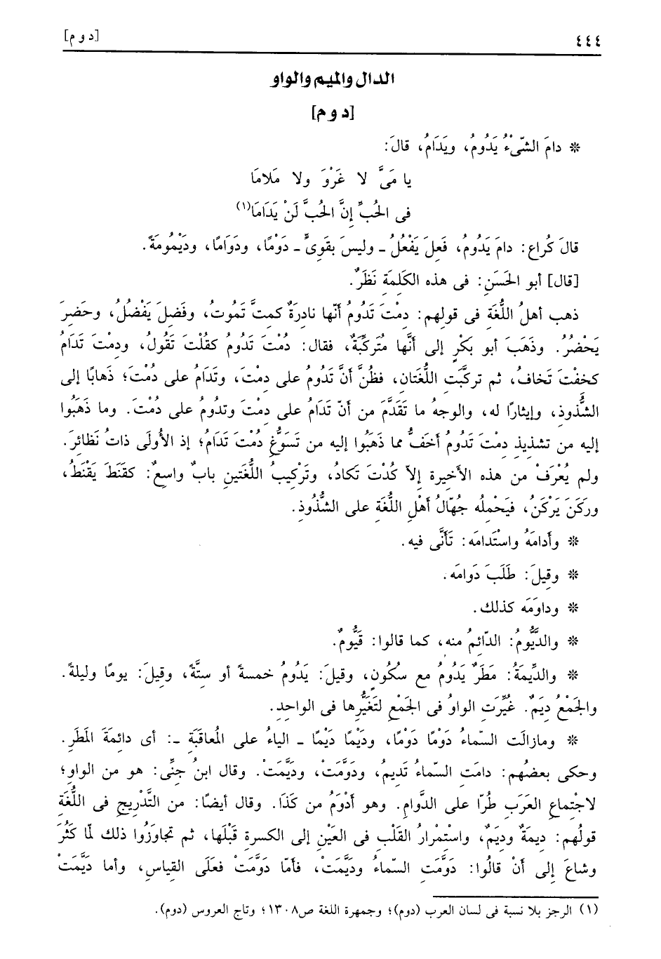 [د وم] دامَ الشّيْءَ يَدُومُ، ويَدَامُ، قالَ: