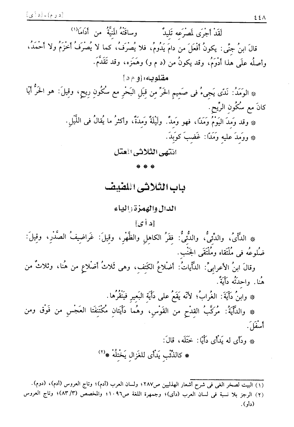 [د أي] الدَّأْيُ، والدِّئيُّ، والدُّئِيُّ: فَقَرُ الكاهِلِ والظَّهِر، وقِيلَ: غَراضِيفُ الصَّدْرِ، وقِيلَ: ضُلوعُه في مُلْتَقاه ومُلْتَقَى الجَنْبِ. وقالَ ابنُ الأَعرابِيِّ: الدًَّأْياتُ: أَضْلاعُ الكَتِفِ، وهي ثلاَثُ أَضْلاعٍ من هُنا، وثلاثٌ من هنُا. واحدَتُه دَاْيَةٌ. وابنُ دَأْيَةَ: الغُرابُ؛ لأَنّه يَقَعًُ على دَأْيَةَ البَعِيرِ فيَنْقُرُها. والدَّأْيَةُ: مُرَكَّبُ القِدْحِ من القَوْسِ، وهُما دَأْيتَانِ مُكْتَنفَتا العَجْسِ من فَوْق ومن أَسْفَلَ. ودَأَى له يَدْأَى دَأْياً: خَتَلَه، قالَ: