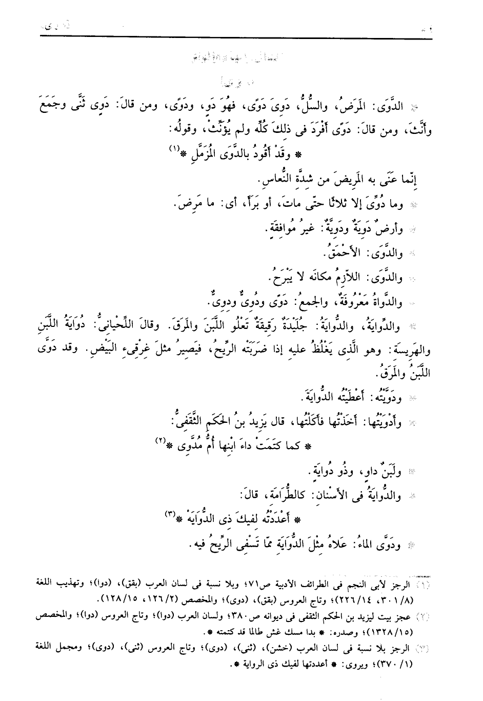 [د وى] الدَّوَى: المَرَضُ، والسُّلُّ، دَوَىَ دَوًى، فهُوَ دَوٍ، ودَوًى، ومن قالَ، دَوٍ ى ثَنَّى وجَمَعَ وأَنَّثَ، ومن قالَ، دَوًى أَفْرَدَ في ذِلكَ كُلِّه ولم يُؤَنِّثْ، وقولُه: