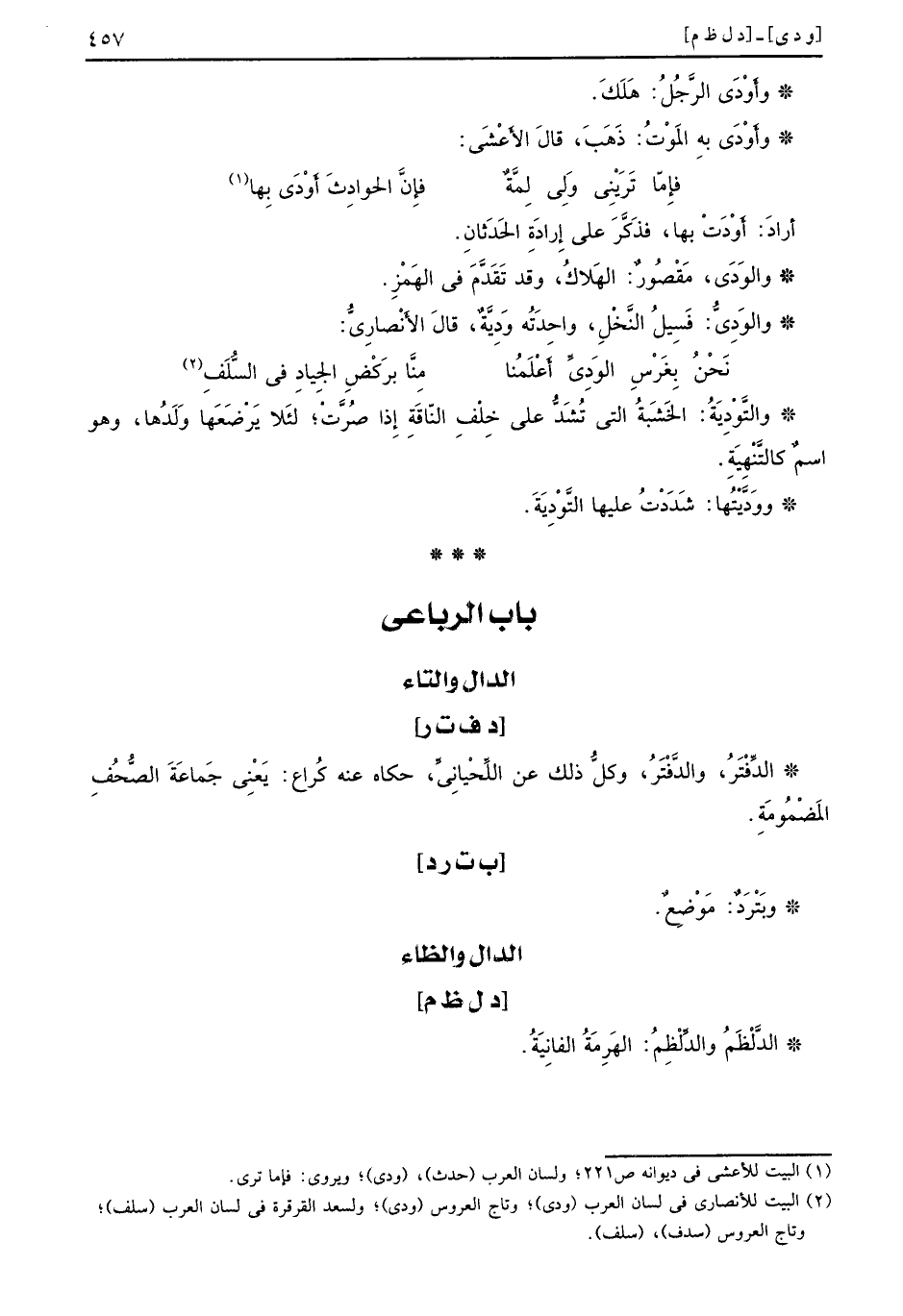أرادَ: أَوْدَتْ بها، فدَكَّرَ على إِرادِةَ الحَدثَانِ. والوَدَى، مَقْصُورٌ: الهَلاكُ، وقد تَقَدَّمَ في الهَمْزِ. والوَدِىٌّ: فَسِيلُ النَّخْلِ، واحِدَتُه وَدِيَّةٌ، قالَ الأَنْصارِىُّ: