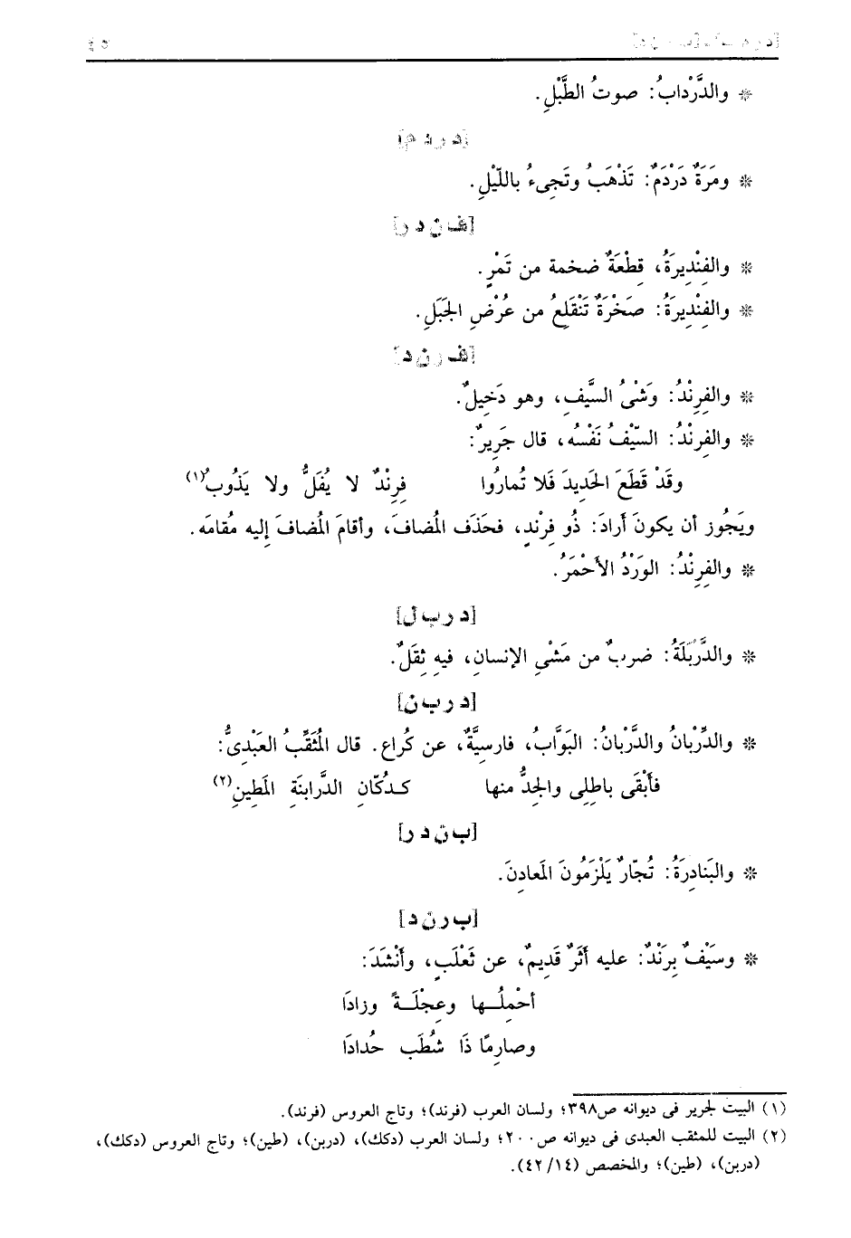 والدَّرْدابُ: صوتُ الطَّبْلِ. [د ر د م] ومَرَةٌ دَرْدَمٌ: تَذَهَبُ وتَجِىءُ باللّيْلِ. [ف ن د ر] والِفنْدِيرَةُ، قطْعَةٌ ضخمة من تَمْرٍ. والفِنْدِيِرَةُ: صَخْرَة تَنْقَلِعُ من عُرْضِ الجَبَلِ. [ف ر ن د] والفِرِنْدُ: وَشْىُ السَّيفِ، وهو دَخِيلٌ. والفِرنْدُ: السّيْفُ نَفْسُه، قال جَرِيرٌ: