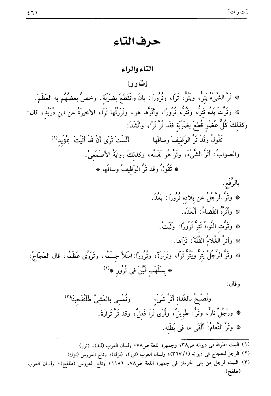 بالرَّفْعِ. وتَرَّ الرَّجُلُ عن بِلادِهِ تُرُوراً: بَعُدَ. وأَتَرَّهُ القَضاءُ: أَبْعَدَه. وتَرَّتِ النَّواةُ تَتِرُّ تُرُوراً: وثَبَتْ. وأترَّ الغُلامُ القُلَةَ: نَزّاها. وتَرَّ الرَّجُلُ يَتِرُّ ويَتُرُّ تَرّا، وتَرَارَةً، وتُرُوراً: امْتَلأَ جِسْمُه، وتَرَوَّى عَظْمُه، قال العَجّاجُ:
