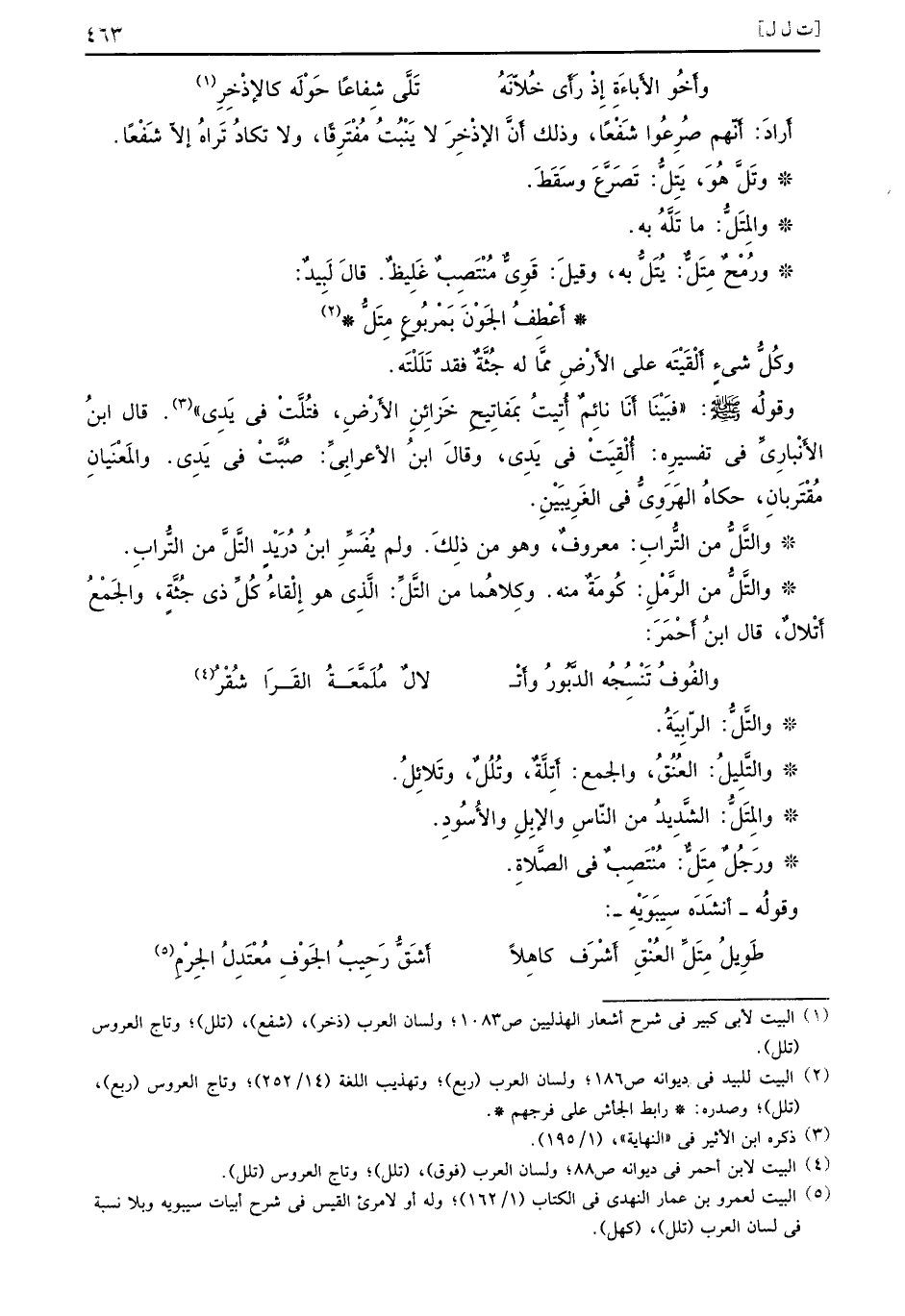 أَرادَ: أَنّهم صُرِعُوا شَفْعاً، وذلك أَنَّ الإذْخِرَ لا يَنْبُتُ مُفْتَرِقّا، ولا تكادُ تَراهُ إلاّ شَفْعاً. وتَلَّ هُوَ، يَتِلُّ: تَصَرَّعَ وسَقَطَ. والمِتَلُّ: ما تَلَّهُ به. ورُمْحٌ مِتَلٌّ: يُتَلُّ به، وقيلَ: قَوِيٌّ مُنْتَصِبٌ غَلِيظٌ. قالَ لَبِيدٌ: