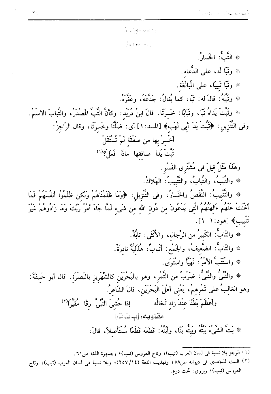 وهَذَا مَثَلٌ قِيلَ في مُشْتَرِى الفَسْوِ. والتَّببُ، والتَّبابُ، والتَّتْبِيبُ: الهَلاكُ. والتَّتْبِيبُ: النَّقْصُ والخَسارُ، وفي التَّنْزِيلِ: {وَمَا ظَلَمْنَاهُمْ وَلَكِن ظَلَمُواْ أَنْفْسَهُمْ فَمَا أَعْنًَتْ عَنْهمُءَ الِهَتُهُمُ الَّتِي يَدْعُونَ مِن دُونِ اللهِ مٍِ ن شَيءٍ لَمَّا جَاءَ أَمْرُ رَبِّكَ وَمَا زَادُوهُمْ غَيْرَ تَتْبِيبٍ} [هود: 101] والتّابُّ: الكَبِيرُ من الرِّجالِ، والأُنْثَى: تابَّةٌ. والتّابُّ: الضَّعِيفُ، والجَمْع: أَتْبابٌ، هُذَلِيَّةٌ نادِرَةٌ. واسْتَتَبَّ الأَمْرُ: تَهَيَّأ واسْتَوَى. والتِّبِّىُّ والتَّبِّىٌّ: ضَرْبٌ من التَّمْرِ، وهو بالبَحْرَيْنِ كالشِّهْرِيِز بالبَصْرِةَ. قال أبو حَينفَةَ: وهو الغالِبُ على تَمْرِهِمْ، يَعْنِي أهْلُ البَحْرَيْنِ، قالَ الشّاعِرُ: