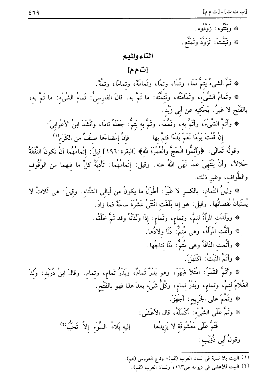 وقولُه تَعالَى: {وأتموا الحج والعمرة لله} [البقرة: 196] قِيلَ: إِتْمامُهُما أنْ تكونَ النَّفَقَةُ حَلالاً، وأَنْ يَنْتَهِىَ عمّا نَهَى اللهُ عنه. وقيل: إِتْمامُهُما: تَأْدِيَةُ كلِّ ما فِيهما من الوُقُوفِ والطَّوافِ، وغيرِ ذلك. وليلُ التِّمامِ، ولكسرِ لا غَيْرُ: أَطْوَلُ ما يكونُ من لَيالِى الشِّتاءِ. وقِيلَ: هي ثَلاثٌ لا يُسْتَبانُ نُقصانُها. وقيل: هو إِذا بَلَغَت اثْنَتَىْ عَشْرَةَ ساعَةً فما زادَ. ووَلَدَتِ المرْأَةُ لِتمٍّ، وتِمامٍ، وتَمامٍ: إِذا وَلَدَتْهُ وقد تَمَّ خَلْقُه. وأَتَّمتِ الَمرْأَةُ: وهى مِتمٌّ: دَنَا وِلادُها. وأَتَّمتِ النّاقَةُ وهي مُتِمٌّ: دَنَا نِتاجُها. وأَتَمَّ النْبْتُ: اكُتَهَلَ. وأَتَمَّ القَمَرُ: امْتَلأ فَبَهَرَ، وهو بَدْرٌ تَمامٌ، وبَدْرُ تَمامٍ، وتِمامِ. وقالَ ابنُ دُرَيْدٍ: وُلِدَ الغُلامُ لِتمٍّ، وتِمامٍ، وبَدْرُ تَمامٍ، وكُلُّ شَيْءٍ بعدَ هذا فهو بالفَتْحِ. وتَمَّمَ على الجَرِيحٍ: أَجْهَزَ. وتَمَّ عَلَى الشَّئِْ: أَكْمَلَهُ، قال الأَعْشَى: