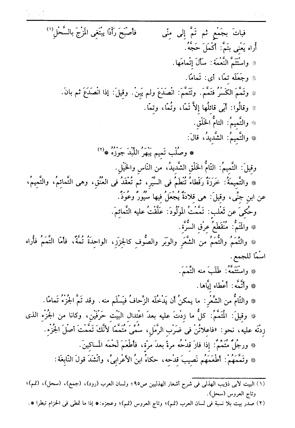 وقِيلَ: التَّمِيمُ: التّامُّ الخَلْقِ الشَّديِدُ، من النّاسِ والخَيْلِ. والتَّمِيمَةُ: خَرَزَةٌ رَقْطاءُ تُنْطَمُ في السَّيْرِ، ثم تَعْقَدُ في العُنٌ قِ، وهى التَّمائِمُ، والتَّمِيمُ، عن ابنِ جِنَّى، وقِيلَ: هي قِلادَةٌ يُجْعَلُ فِيها سُيُورٌ وعُوَذٌ. وحُكِىَ عن ثَعْلبٍ: تَمَّمْتُ المُوْلُودَ: عَلَّقْتُ عليه التَّمِائِمَ. والَمتَمُّ: مُنْقَطَعُ عِرْقِ السُّرَّةِ. والتِّمَمُ والتُّمَمُ من الشَّعَرِ والوَبَر والصُّوفِ كالجِزَزِ، الواحِدَةُ تُمَّةٌ، فأَمّا التَّمَمُ فأُراه اسْمًا للجمع. واسْتَتَمَّهُ: طَلَبَ منه التِّمَمَ. وأَتَّمَّه: أَعْطاه إِيَّاها. والتّامُّ من الشِّعْرِ: ما يمكنُ أَن يَدْخُلَه الزِّحافُ فَيسْلَم منه. وقد تَمَّ الجُزْءُ تَمامًا. وقِيلَ: المُتَمَّمُ: كلُّ ما زِدْتَ عليه بعدَ اعْتِدالِ البَيْتِ حَرْفَيْنِ، وكانا من الجْزْءِ الذي زِدْتَه عليه، نحو: ((فاعِلاتُنْ في ضَرْبِ الرَّمَلِ، سُمِّىَ مُتَممَّاً لأَنَّكَ تَمَّمْتَ أصْلَ الجُزْءِ. ورجُلٌ مُتَمِّمٌ: إِذا فازَ قِدْحُه مرةً بعدَ مرّةٍ، فأَطْعَمَ لَحْمَه المَساكيِنَ. وتَمَّمَهُمْ: أَطْعَمَهُم نَصِيبِ قِدْحِه، حكاهُ ابنُ الأًَعْرابِىِّ، وأنْشَدَ قولَ النّابِغَة: