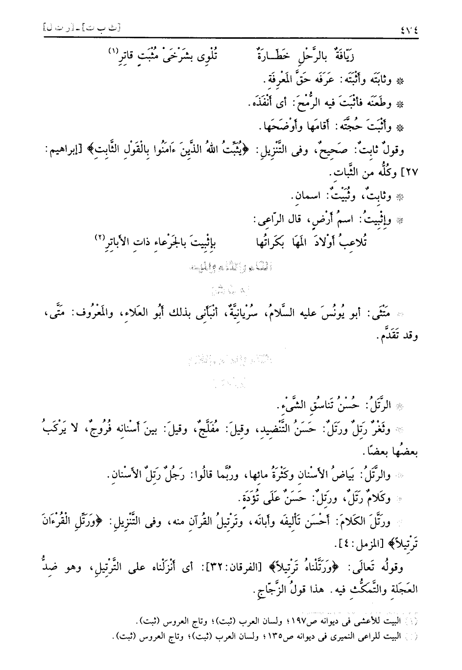 [ر ت ل] الرَّتَلُ: حُسْنُ تَناسُقِ الشَّىْءِ. وثَغْرٌ رَتِلٌ ورَتَلٌ: حَسَنُ التَّنْضِيدِ، وقِيلَ: مُفَلَّجٌ، وقيلَ: بينَ أَسْنانِه فُرُوجٌ، لا يَرْكَبُ بعضُها بعضاً. والرَّتَلُ: بَياضُ الأَسْنانِ وكَثْرَةُ مائِها، ورُبَّما قالُوا: رَجُل رَتِلٌ الأَسْنانِ. وكَلامٌ رَتَلٌ، ورِتَلٌ: حَسَنٌ عَلَى تُؤَدَةٍ. ورَتَّلَ الكَلامَ: أَحْسَن تَأْلِيفَه وأَبانَه، وتَرِتْيلُ القُرآنِ منه، وفي التنَّزْيِلِ: {وَرَتِّلِ الْقُرْءَانَ تَرْتْيلاً} [المزمل: 4] . وقولُه تَعالَى: {ورتلناه ترتيلا} [الفرقان: 32] : أي أَنْزَلْناه على التَّزْتِيلِ، وهو ضِدُّ العَجَلةِ والتّمَكُّثِ فِيه. هذا قولُ الزَّجَّاجِ.