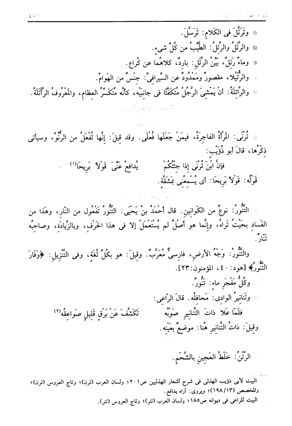 وتَرَتَّلَ في الكَلامِ: تَرَسَّلَ. والرَّتَلُ والرِتَّلُ: الطَّيِّبُ من كُلِّ شيءٍ. وماءٌ رَتِلٌ، بَيِّنُ الرَّتَلِ: بارِدٌ، كلاهُما عن كُراع. والرُّتَيْلا، مقصورٌ ومَمْدٌ ودُ عن السِّيرافِيِّ: جِنْسٌ من الهَوامِّ. والرَّاِتلَةُ: أنْ يَمْشِى الرَّجُلُ مُتَكَفَّئاً في جانِبَيهُ، كأنَّه متُكَسِّرُ العِظامِ، والَمْعرُوفُ الرَّأتلَةُ.