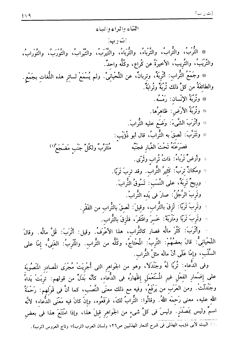 [ت ر ب] التُّرْبُ، والتُّرابُ، والتَّرْباءُ، والتُّرَباءُ، والتَّيْرَبُ، والتَّيْرابُ، والتَّوْرَبُ، والتَّوْرابُ، والتِّرْيَبُ، والتَّرِيبُ، الأخَيرَةُ عن كُراع، وكله واحدةٌ وجمعُ الترابِ: أتربةٌ، وتربانٌ، عن اللحياني ولم يسمع لسلئر هذه اللغات بجمعٍ والطائفةُ من كُلُّ ذلك تُرْبَةٌ وتُرابَةٌ. وتُرْبَةُ الإنْسانِ: رَمْسُه. وتُرْبَةُ الأَرضِ: ظاهِرُها. وأَتْرَبَ الشَّىءَ: وَضَع عليه التُّرابَ. وتَتَرَّبَ: لَصِقَ به التُّرابُ، قال أبو ذُؤَيْبٍ: