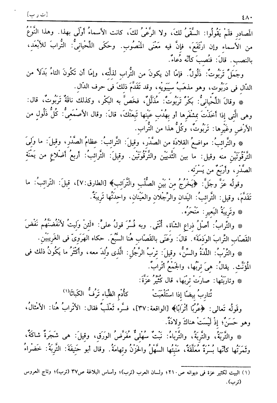المَصادر فلَمْ يَقُولُوا: السَّقْىُ لكَ، ولا الرَّعْىُ لكَ، كانت الأَسماءُ أَوْلَى بهذا. وهذا النَّوْعُ من الأَسماءِ وإن ارْتَفَعَ، فإِنَّ فيه مَعْنَى المَنْصٌ وبِ. وحَكَى اللِّحْيانِىُّ: التُّرابَ للأَبْعَدِ، بالنصبِ. قالَ: فُنصِبَ كأَنّه دُعاءُ. وجَمَلٌ تَرَبُوتٌ: ذَلُولُ. فإمّا أن يكونَ من التُّرابِ لِذلَّتٍِ هـ، وإمّا أَنْ تَكُون التاءُ بَدَلاً من الدّالِ في دَرَبُوتٍ، وهو مذهَبُ سَيَبَويْهِ، وقد تَقَدَّمَ ذَلكَ في حرف الدّالِ. وقالَ اللِّحْيانِىُّ: بَكْرٌ تَرَبُوتٌ: مُذَلَّلٌ، فخَصَّ به البَكْر، وكذلك ناقَةٌ تَرَبُوتٌ، قال: وهي الَّتِى إِذا أَخَذْتَ بِمشْفَرِها أو بِهْذْبِ عَيْنِها تَبِعَتْكَ، قالَ: وقال الأًَصْمَعِىُّ: كُلُّ ذَلُولٍ من الأَرْضِ وغَيْرها: تَرَبُوتٌ، وكُلُّ هذا من التُّرابِ. والتَّرائِبُ: مواضِعُ القَلادَة من الصَّدْرِ، وقِيلَ: التَّرِائبُ: عِظامُ الصَّدْرِ، وقِيلَ: ما وَلَىَ التَّرْقوَتَيْنِ منه وقيل: ما بين الثَّديَيْنَ والتَّرْقُوَتَيْن. وقِيلَ: التَّرائِبُ: أَربعُ أَضْلاعٍ من يَمْنَةِ الصَّدْرِ، وَأَرْبَعٌ من يَسْرِتَه. وقولُه عَزَّ وجَلَّ: {يخرج من بين الصلب والترائب} [الطارق: 7] ، قِيلَ: التّرِائِبُ: ما تَقَدَّمَ، وقيل: التَّرائِبُ: اليَدانِ والرِّجْلانِ والعَيْنانِ، واحِدَتُها تَرِيبَةٌ. وتَرِيبَةُ البَعِيرِ: مَنْحَرُه. والتِّرابُ: أَصْلُ ذِراعِ الشّاةِ، أُنْثَى. وبه فُسِّرَ قولُ علىٍّ: ((لَئِنْ وَلِيت لأَنْفُضَنَّهُم نَفْضَ القَصّابِ التِّرابَ الوَذِمَةَ)) . قالَ: وَعَنَى بالقَصّابِ هُنا السَّبُعَ. حكاه الهَرَوِىّ في الغَرِيبَيْنِ. والتِّرْب: اللِّدَةُ والسِّنُّ، وقِيلَ: ترْبُ الرَّجُلِ: الَّذِى وُلِدَ معه، وأَكْثَرُ ما يَكُونُ ذلك في المُؤَنَّثِ. يقالُ: هِيَ تِرْبُها، والجَمْعُ أتْرابٌ. وتارَبَتْها: صارَتْ تِرْبَها، قال كُثَيِّرُ عَزَّةَ.