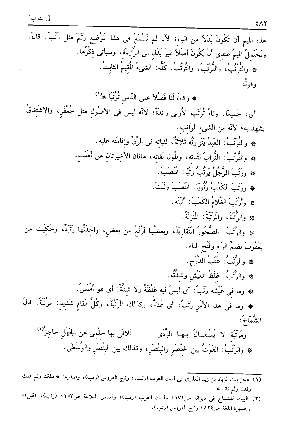 أي: جَمِيعاً وتاءُ تُرْتَب الأُولى زِائدَةُ، لأنّه ليس في الأصُولِ مثل جُعفَرٍ، والاشْتِقاقُ يشهد به؛ لأنّه من الشيءِ الرّاتِبِ. والتُّرْتَبُ: العَبدُ يَتَوارَثُه ثَلاثَةٌ، لثَباِته في الرِّقِّ وإِقامَتِه عليه. والتُّرْتَبُ: التُّرابُ لثَباِته، وطُولِ بَقائِه، هاتان الأَخٍِ يرتانِ عن ثَعْلَبٍ. ورَتَبَ الرَّجُلُ يَرْتُبُ رَتْباً: انْتَصَبَ. ورَتَبَ الكَعْبُ رُتُوباً: انْتَصَبَ وثبتَ. وأرَتَبَ الغُلامُ الكَعْبَ: أَثْبَتَه. والرُّتْبَةُ، والمُرْتَبَةُ: المَنْزِلَةُ. والرَّتَبُ: الصُّخُورُ المُتَقارِبَةُ، وبعضُها أَرْفَعُ من بعضٍ، واحِدَتُها رَتَبَةُ، وحُكِيَتَ عن يَعْقُوبَ بضمِّ الرّاءِ وفَتْحَِ التاء. والرَّتَبُ: عَتَبُ الدَّرَجِ. والرَّتَبُ: غِلَظُ العَيْشِ وشِدَّتَّهُ. وما فِي عَيْشِه رَتَبٌ: أي ليسَ فيه غلْظَةٌ ولا شِدَّةُ: أي هو أَمْلَسُ. وما في هذا الأَمْرِ رَتَبٌ. أي عَناءٌ، وكذلك المَرْتَبَةُ، وكُلُّ مَقامٍ شَدِيدٍ: مَرْتَبَةٌ. قالَ الشَّمّاخُ: