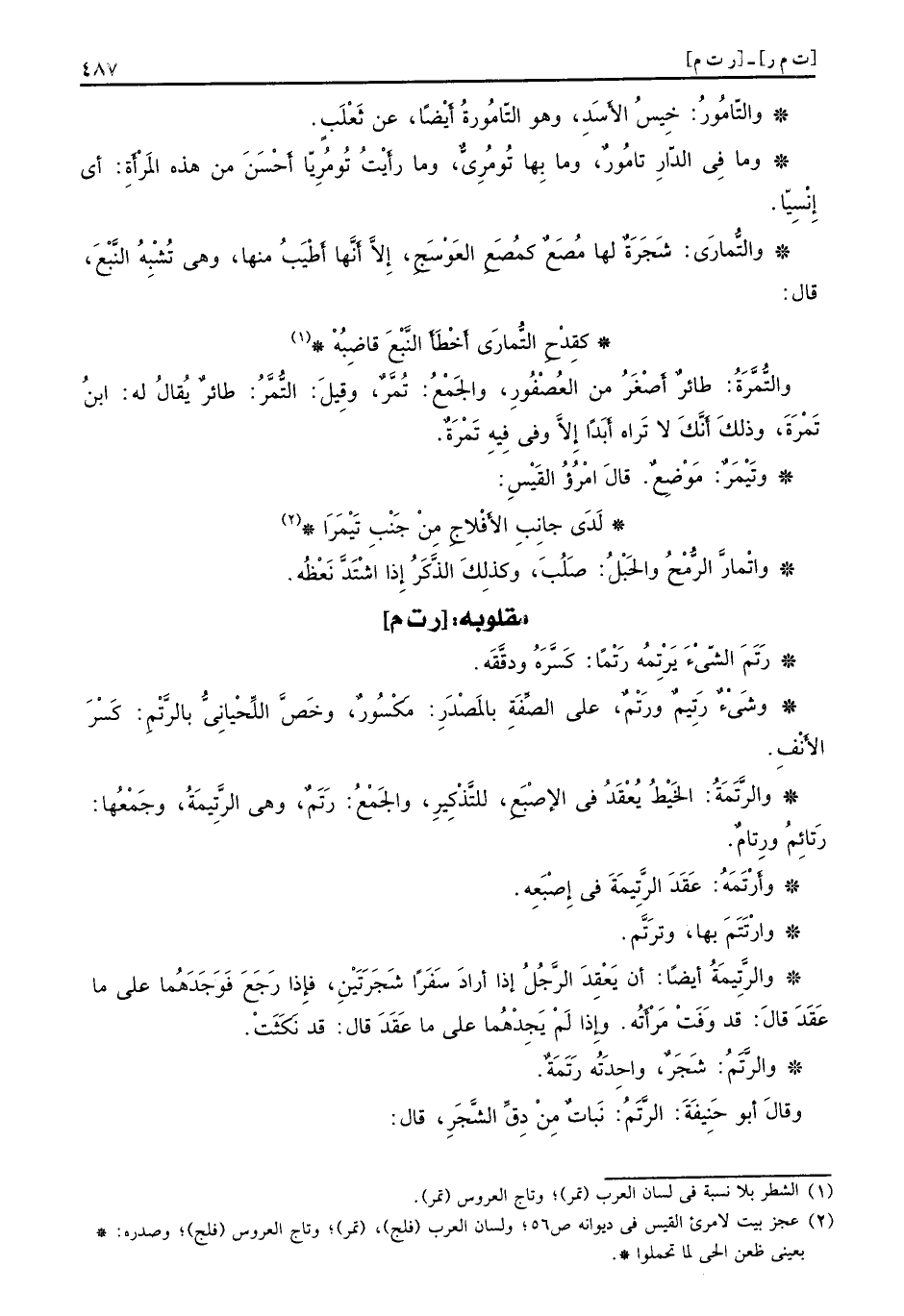 والتّامُورُ: خِيسُ الأَسَدِ، وهو التّامُورةُ أَيْضاً، عن ثَعْلَب. وما فِي الدّارَِ تامُورٌ، وما بِها تُومُرِىٌّ، وما رأَيْتَ تُومُرِيّا أَحْسنَ من هذه المَرْأَةِ: أي إِنْسِياً. والتُّمارَى: شَجَرَةٌ لها مُصَعٌ كمُصَعِ العَوْسَجِ، إِلاَّ أَنَّها أَطْيَبُ منها، وهي تُشْبِهُ النَّبْعَ، قال: