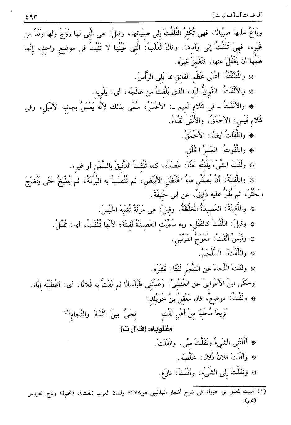 ويَدَع عليها صِبيْاناً، فهي تُكْثُرِ التَّلَفُّتَ إِلى صِبْيانها، وقِيلَ: هي الَّتِي لها زَوْجٌ ولها وَلَدٌ من غَيْرِه، فهِي تَلَفَّتُ إلى وَلَدها. وقالَ ثَعْلَبٌ: الَّتِى عَيْنُها لا تَثْبُتُ في موضِعِ واحِدٍ، إِنّما هَمُّها أن يَغْفُلَ عنها، فَتغْمِزَ غيرَه. والمُتَلَفِّتَهُ: أعْلَى عَظْمِ الفائِقِ مما يَلَى الرَّأْسَ. والأَلْفَتُ: القَوِىُّ اليَدِ، الذي يَلْفِتُ من عالَجَة، أي: يَلْوِيهِ. والأَلْفَتُ - في كَلام تَمِيم -: الأَعْسَرُ، سُمِّى بذلك لأَنَّه يَعْمَلُ بجانِبِه الأَمْيَلِ، وفي كَلامِ قَيْسٍ: الأَحْمَقُ والأُنْثَى لَفْتَاءُ. واللَّفَاتُ أيضاً: الأَحْمَقُ. واللَّفُوتُ: العَسِرُ الخُلُقِ. والفَتَ الشَّيْءَ يَلْفِتُه لَفْتاً: عَصَدَه، كما تَلْفِتُ الدَّقِيقَ بالسَّمْنِ أو غيرِه. واللَّفِيتُهُ: أَنْ يُصَفَّى ماءُ الحَنْظَلِ الأَبْيَضِ، ثم تُنْصَبُ به البُرْمَةُ، ثم يُطْبَخُ حَتّى يَنْضَجَ ويَخْثُرَ، ثم يُذَرٌّ عليه دَقِيقٌ، عن أبي حَنِيفَةَ. واللَّفِيتَةُ: العَصِيدَةُ المُغلَّظَةُ، وقِيلَ: هي مَرَقَةٌ تُشْبهُ الحَيْسَ. وقيلَ: اللَّفْتَ كالفَتْلِ: وبه سُمِّيًَتِ العَصِيدَةُ لَفِيتَةً، لأَنَّها تُلْفَتُ، أي: تُفْتَلُ. وتَيْسٌ أَلْفَتُ: مُعْوَج القَرْنَيْنِ. واللِّفْتَ: السَّلْجَمُ. ولَفَت اللَّحاءَ عن الشَّجَر لَفْتًا: قَشَرَه. وحَكَى ابنُ الأَعْرابيِّ عن العُقَيْلْيِّ: وَعَدْتَنِي طَيْلَساناً ثم لَفَتَّ به فُلاناً، أي: أعْطَيْتَه إِيّاه. ولَفْتٌ: موضِعٌ، قال مَعْقِلُ بنُ خُوَيْلِدٍ.