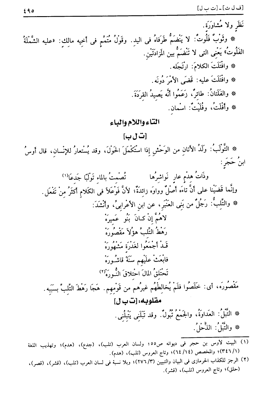نَظَر ولا مُشاوَرَة. وثَوْبٌ قَلُوتٌ: لا يَنضَمُّ طَرَفاهُ في اليدِ. وقَوْلُ مُتَمِّمِ في أَخِيه مالِكِ، ((عليه الشَّمْلَةُ الفَلُوتُ)) يَعْنى التي لا تَنْضَمُّ بين المَزادَتَيْنِ. وافْتَلَتَ الكلامَ: ارْتَجَلة. وافْتلَتَ عليه: قَضَى الأَمْرَ دُونَه. والفَلَتانُ: طائِرُ، زَعَمُوا أَنَّه يَصٍ يدُ القِردَة. وأَفْلَتُ، وفُلَيْتٌ: اسْمانِ.